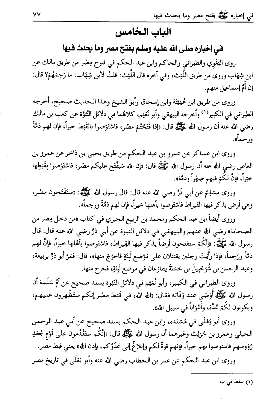 الباب الخامس في إخباره صلى الله عليه وسلم بفتح مصر وما يحدث فيها