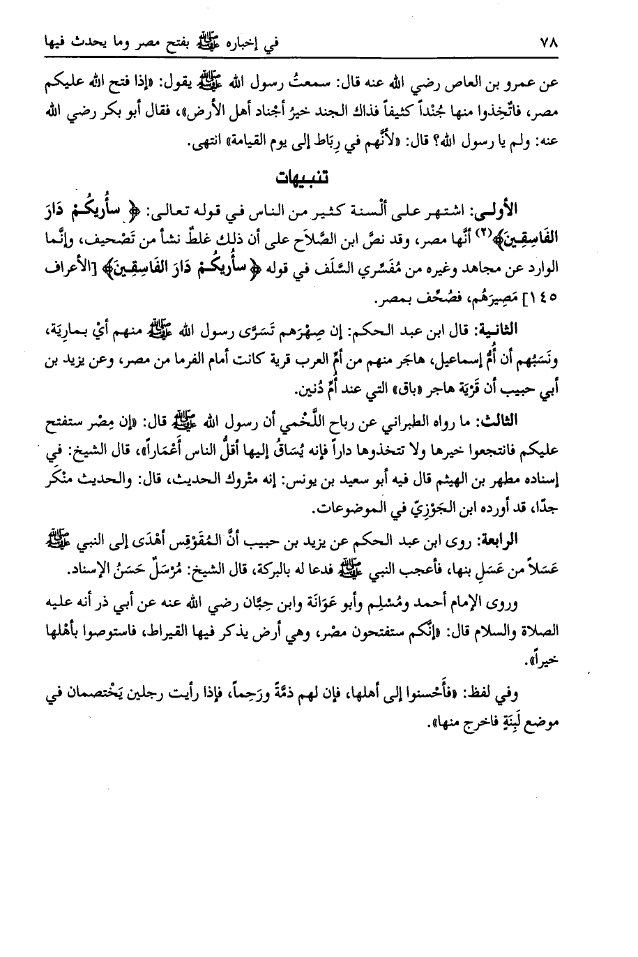 الأولى: اشتهر على ألسنة كثير من الناس في قوله تعالى: سَأُرِيكُمْ دارَ الْفاسِقِينَ أنها مصر، وقد نص ابن الصلاح على أن ذلك غلط نشأ من تصحيف، وإنما الوارد عن مجاهد وغيره من مفسري السلف في قوله سَأُرِيكُمْ دارَ الْفاسِقِينَ [الأعراف 145] مصيرهم، فصحف بمصر.
