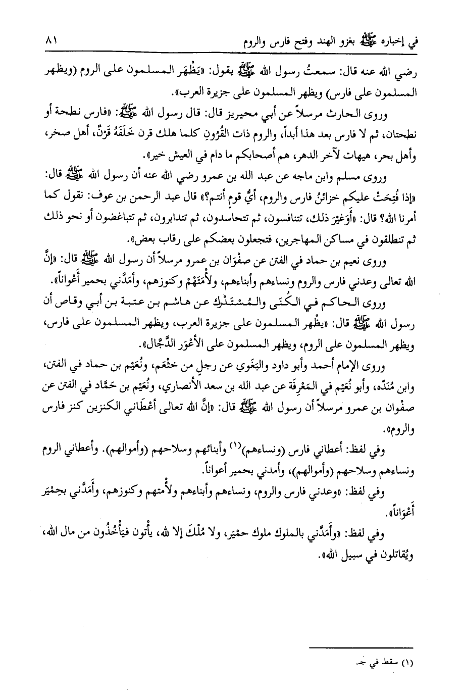 وروى نعيم بن حماد في الفتن عن صفوان بن عمرو مرسلا أن رسول الله صلى الله عليه وسلم قال: «أن الله تعالى وعدني فارس والروم ونساءهم وأبناءهم، ولأمتهم وكنوزهم، وأمدني بحمير أعوانا» .
