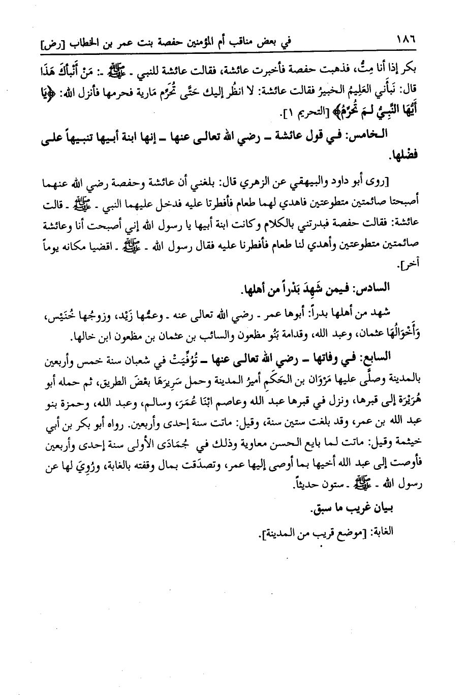 الخامس: في قول عائشة- رضي الله تعالى عنها- إنها ابنة أبيها تنبيها على فضلها.
