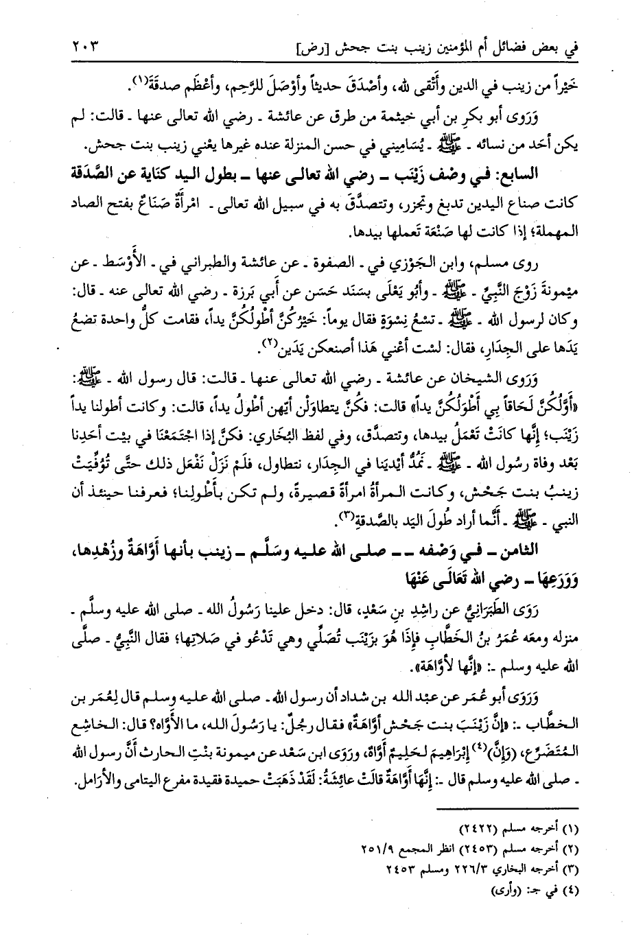 وروى الشيخان عن عائشة- رضي الله تعالى عنها- قالت: قال رسول الله- صلى الله عليه وسلّم: «أوّلكنّ لحاقا بي أطولكن يدا» قالت: فكنّ يتطاولن أيّهن أطول يدا، قالت: وكانت أطولنا يدا زينب، إنّها كانت تعمل بيدها، وتتصدّق،