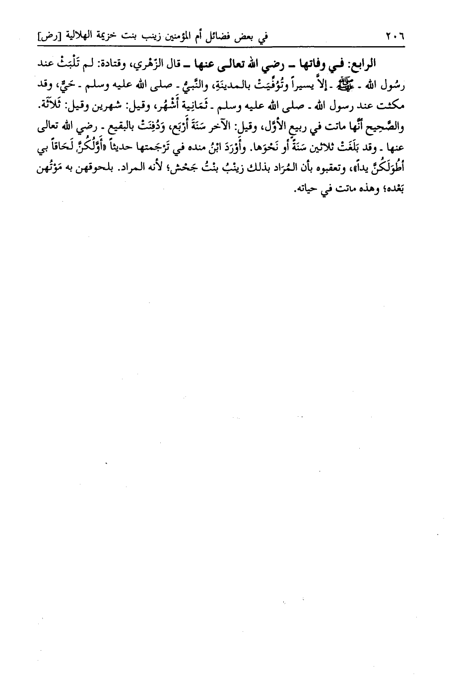 والصّحيح إنها ماتت في ربيع الأوّل، وقيل: الآخر سنة أربع، ودفنت بالبقيع- رضي الله تعالى عنها- وقد بلغت ثلاثين سنة أو نحوها. وأورد ابن مندة في ترجمتها حديثا «أوّلكنّ لحاقا بي أطولكن يدا» ، وتعقبوه بأن المراد بذلك زينب بنت جحش، لأنه المراد. بلحوقهن به موتهن بعده، وهذه ماتت في حياته.