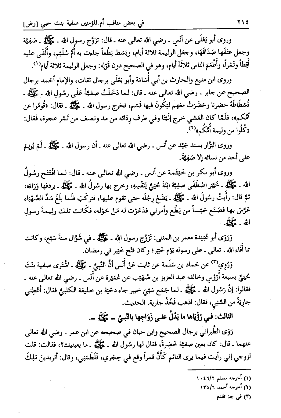 وروى ابن منيع والحارث بن أبي أسامة وأبو يعلى برجال ثقات، والإمام أحمد برجال الصحيح عن جابر- رضي الله تعالى عنه- قال: لما دخلت صفيّة على رسول الله- صلى الله عليه وسلّم- فسطاطه حضرنا وحضرت معهم ليكون فيها قسم، فخرج رسول الله- صلى الله عليه وسلّم- فقال: «قوموا عن أمّكم» ، فلما كان العشي خرج إلينا وفي طرف ردائه من مد ونصف من تمر عجوة، فقال: