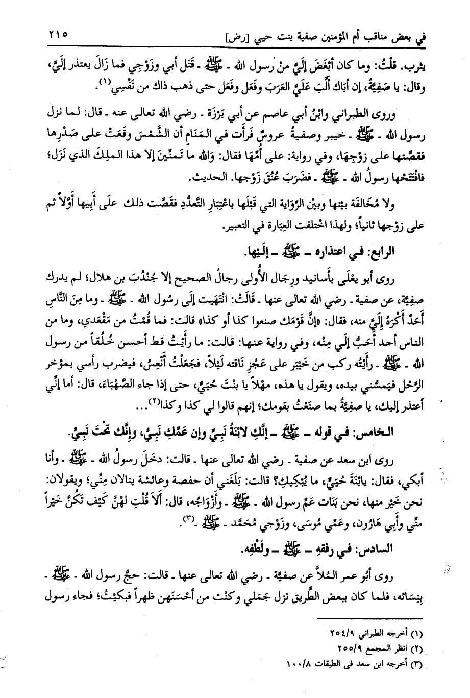 روى أبو يعلى بأسانيد ورجال الأولى رجال الصحيح إلا جندب بن هلال، لم يدرك صفيّة، عن صفية- رضي الله تعالى عنها- قالت: انتهيت إلى رسول الله- صلى الله عليه وسلّم- وما من الناس أحد أكره إلي منه، فقال: «إنّ قومك صنعوا كذا أو كذا» قالت: فما قمت من مقعدي، وما من الناس أحد أحب إلي منه،