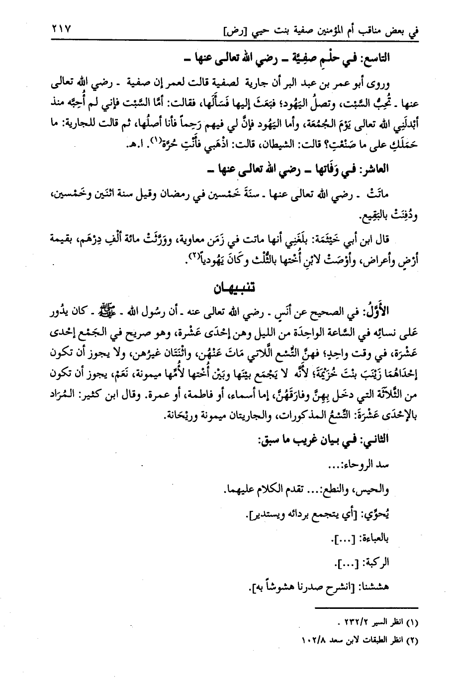 وروى أبو عمر بن عبد البر أن جارية لصفية قالت لعمر إن صفية- رضي الله تعالى عنها- تحبّ السّبت، وتصل اليهود، فبعث إليها فسألها، فقالت: أمّا السّبت فإني لم أحبّه منذ أبدلني الله تعالى يوم الجمعة، وأما اليهود فإنّ لي فيهم رحما فأنا أصلها، ثم قالت للجارية: ما حملك على ما صنعت؟ قالت: الشيطان، قالت: اذهبي فأنت حرّة [ (1) ] . ا. هـ.