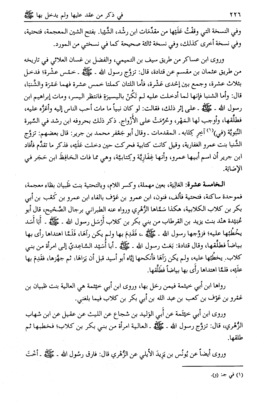 وروى ابن أبي خيثمة عن أبي الوليد بن شجاع عن الليث عن عقيل عن ابن شهاب الزّهري، قال: تزوّج رسول الله- صلى الله عليه وسلم- العالية امرأة من بني بكر بن كلاب، فخطبها ثم طلقها.