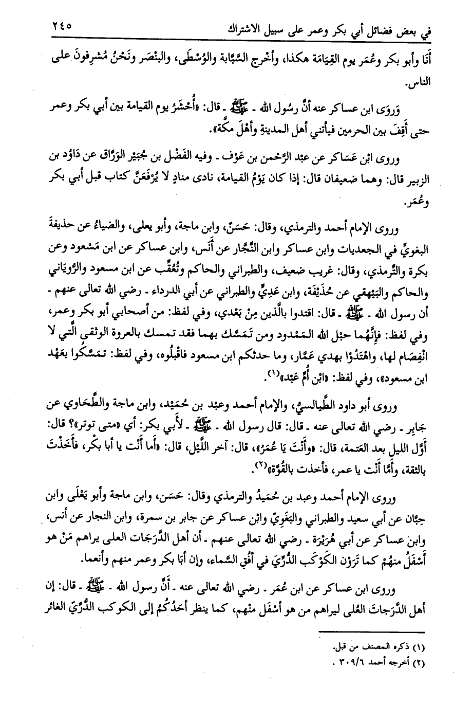 وروى الإمام أحمد والترمذي، وقال: حسن، وابن ماجه، وأبو يعلى، والضياء عن حذيفة البغويّ في الجعديات وابن عساكر وابن النّجّار عن أنس، وابن عساكر عن ابن مسعود وعن بكرة والترمذي، وقال: غريب ضعيف، والطبراني والحاكم وتعقّب عن ابن مسعود والرّوياني والحاكم والبيهقي عن حذيفة، وابن عديّ والطبراني عن أبي الدرداء- رضي الله تعالى عنهم- أن رسول الله- صلى الله عليه وسلم- قال: اقتدوا بالذّين من بعدي، وفي لفظ: من أصحابي أبو بكر وعمر، وفي لفظ: فإنّهما حبل الله الممدود ومن تمسّك بهما فقد تمسك بالعروة الوثقى الّتي لا انفصام لها، واهتدوا بهدي عمّار، وما حدثكم ابن مسعود فاقبلوه، وفي لفظ: تمسّكوا بعهد ابن مسعود» ، وفي لفظ: «ابن أمّ عبد»
