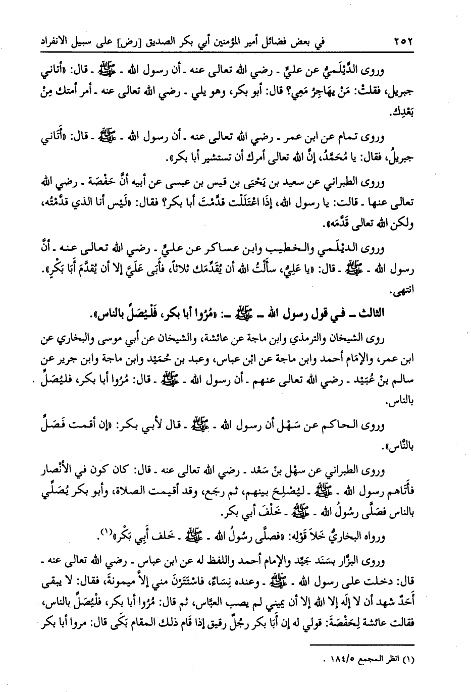 روى الشيخان والترمذي وابن ماجة عن عائشة، والشيخان عن أبي موسى والبخاري عن ابن عمر، والإمام أحمد وابن ماجه عن ابن عباس، وعبد بن حميد وابن ماجة وابن جرير عن سالم بن عبيد- رضي الله تعالى عنهم- أن رسول الله- صلى الله عليه وسلم- قال: مروا أبا بكر، فليصلّ بالناس.