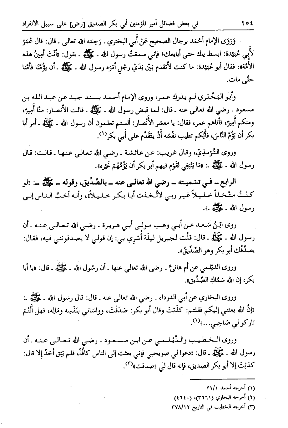 وأبو البختري لم يدرك عمر، وروى الإمام أحمد بسند جيد عن عبد الله بن مسعود- رضي الله تعالى عنه- قال: لما قبض رسول الله- صلى الله عليه وسلّم- قالت الأنصار: منّا أمير، ومنكم أمير، فأتاهم عمر، فقال: يا معشر الأنصار: ألستم تعلمون أن رسول الله- صلى الله عليه وسلّم- أمر أبا بكر إن يؤمّ النّاس، فأيّكم تطيب نفسه أن يتقدّم على أبي بكر [ (1) ] .