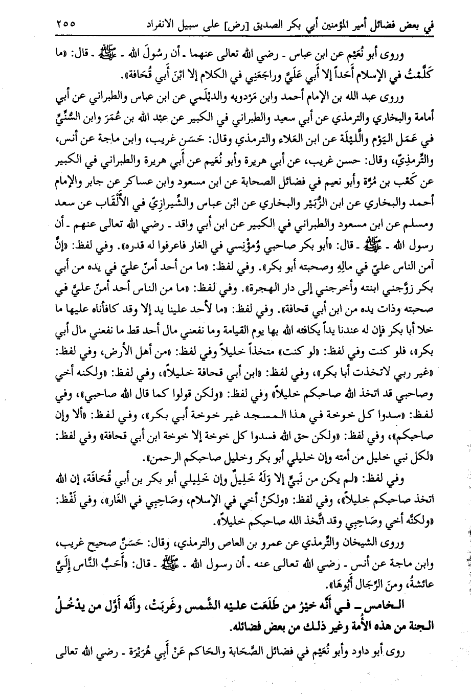 الخامس- في أنه خير من طلعت عليه الشمس وغربت، وأنه أول من يدخل الجنة من هذه الأمة وغير ذلك من بعض فضائله.
