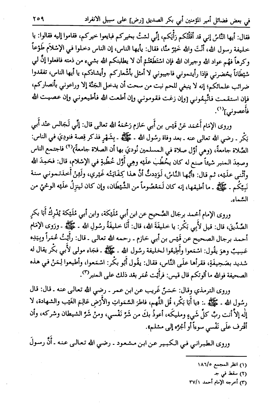 وروى الإمام أحمد برجال الصحيح عن ابن أبي مليكة، وابن أبي مليكة يدرك أبا بكر الصديق، قال: قيل لأبي بكر: يا خليفة الله، قال: أنا خليفة رسول الله- صلى الله عليه وسلّم- وروى الإمام أحمد برجال الصحيح عن قيس بن أبي حازم- رحمه الله تعالى- قال: رأيت عمرا وبيده عسيب وهو يقول: اسمعوا وأطيعوا لخليفة رسول الله- صلى الله عليه وسلم- فجاء مولى لأبي بكر يقال له شديد بصحيفة، فقرأها على الناس، فقال: يقول أبو بكر: اسمعوا، وأطيعوا لمن في هذه الصحيفة فو الله ما ألوتكم قال قيس: فرأيت عمر بعد ذلك على المنبر [ (3) ] .