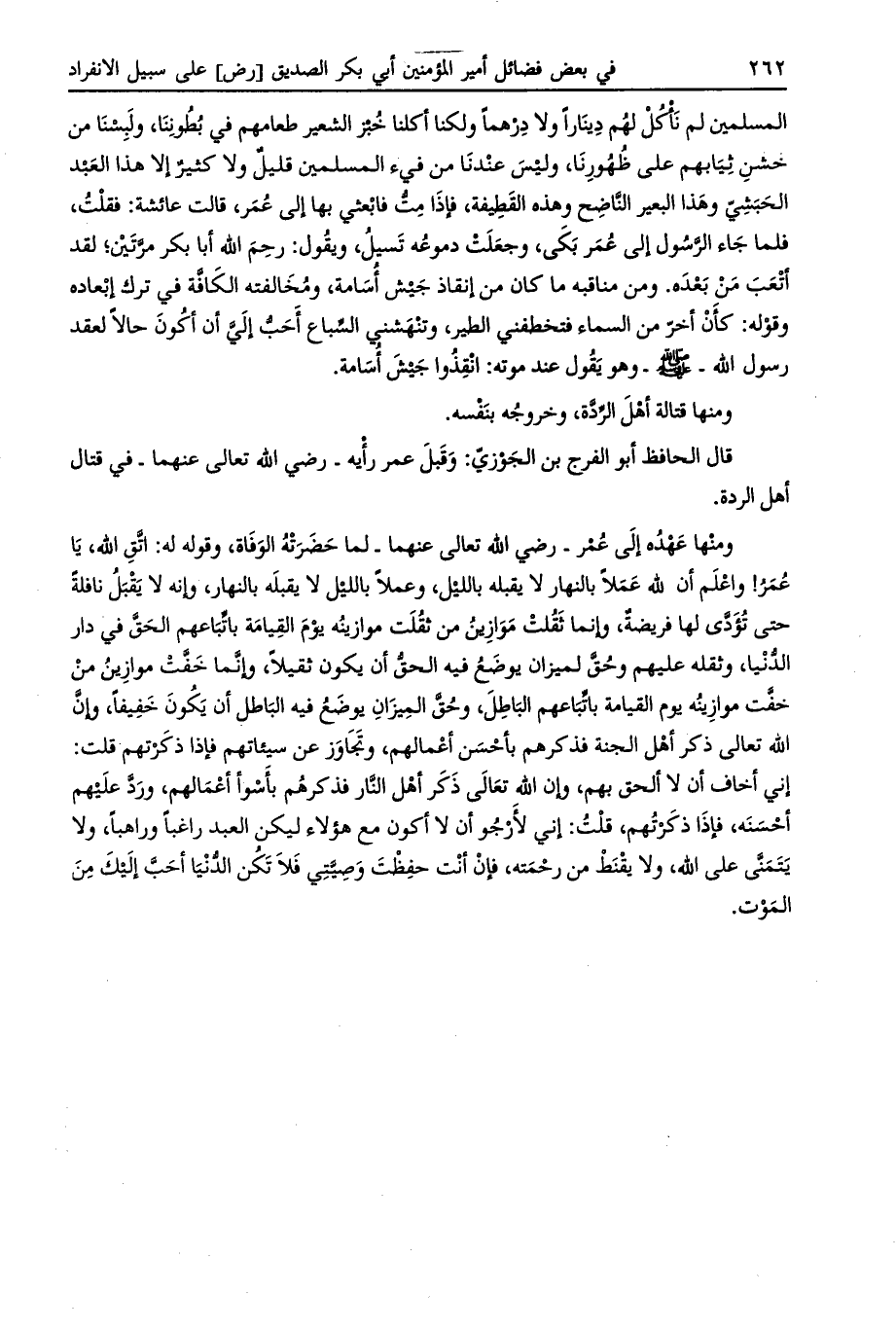 ومنها عهده إلى عمر- رضي الله تعالى عنهما- لما حضرته الوفاة، وقوله له: اتق الله، يا عمر! واعلم أن لله عملا بالنهار لا يقبله بالليل، وعملا بالليل لا يقبله بالنهار، وإنه لا يقبل نافلة حتى تؤدّى لها فريضة، وإنما ثقلت موازين من ثقلت موازينه يوم القيامة باتّباعهم الحقّ في دار الدّنيا، وثقله عليهم وحقّ لميزان يوضع فيه الحقّ أن يكون ثقيلا، وإنّما خفّت موازين من خفّت موازينه يوم القيامة باتّباعهم الباطل، وحقّ الميزان يوضع فيه الباطل أن يكون خفيفا، وأن الله تعالى ذكر أهل الجنة فذكرهم بأحسن أعمالهم، وتجاوز عن سيئاتهم فإذا ذكرتهم قلت: