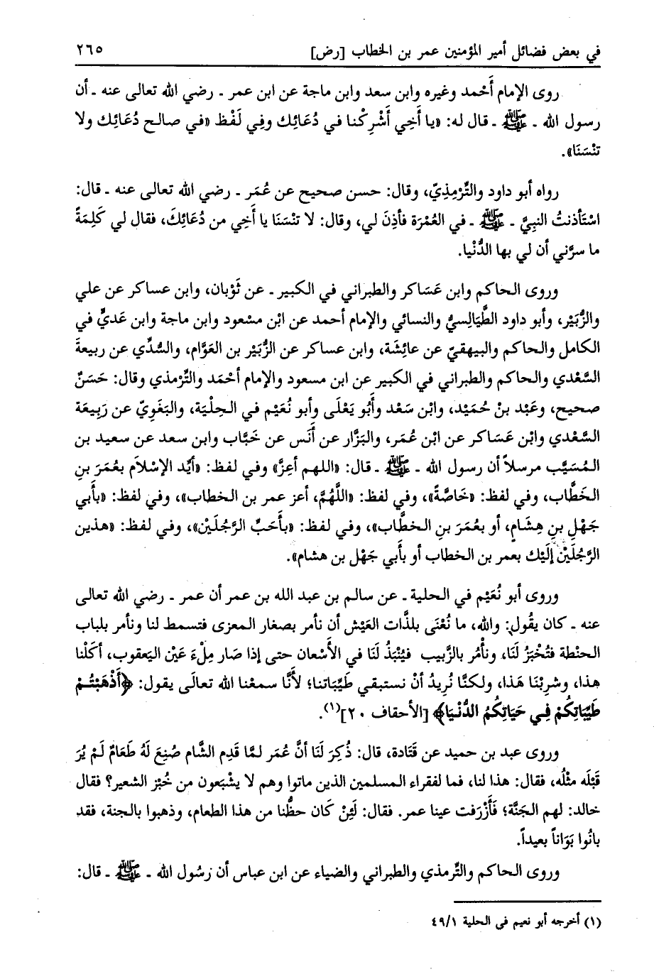 وروى أبو نعيم في الحلية- عن سالم بن عبد الله بن عمر أن عمر- رضي الله تعالى عنه- كان يقول: والله، ما نعنى بلذّات العيش أن نأمر بصغار المعزى فتسمط لنا ونأمر بلباب الحنطة فتخبز لنا، ونأمر بالزّبيب فينبذ لنا في الأسعان حتى إذا صار ملء عين اليعقوب، أكلنا هذا، وشربنا هذا، ولكنّا نريد أن نستبقي طيّباتنا، لأنّا سمعنا الله تعالى يقول: أَذْهَبْتُمْ طَيِّباتِكُمْ فِي حَياتِكُمُ الدُّنْيا [الأحقاف 20] [ (1) ] .