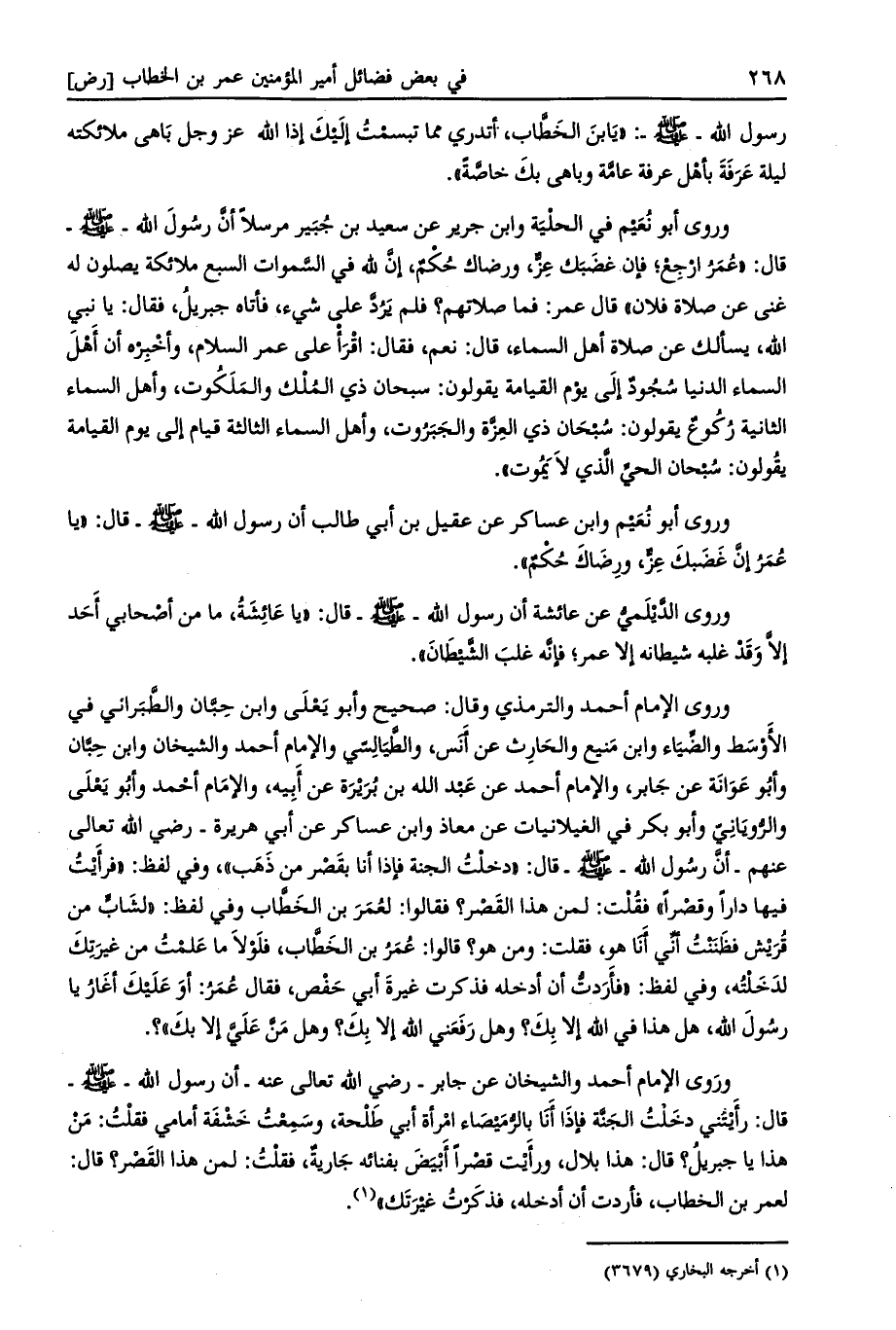 وروى الإمام أحمد والترمذي وقال: صحيح وأبو يعلى وابن حبان والطبراني في الأوسط والضّياء وابن منيع والحارث عن أنس، والطيالسي والإمام أحمد والشيخان وابن حبان وأبو عوانة عن جابر، والإمام أحمد عن عبد الله بن بريرة عن أبيه، والإمام أحمد وأبو يعلى والرّويانيّ وأبو بكر في الغيلانيات عن معاذ وابن عساكر عن أبي هريرة- رضي الله تعالى عنهم- أن رسول الله- صلى الله عليه وسلم- قال: «دخلت الجنة فإذا أنا بقصر من ذهب» ، وفي لفظ: «فرأيت فيها دارا وقصرا» فقلت: لمن هذا القصر؟ فقالوا: لعمر بن الخطاب وفي لفظ: «لشابّ من قريش فظننت أنّي أنا هو، فقلت: ومن هو؟ قالوا: عمر بن الخطاب، فلولا ما علمت من غيرتك لدخلته، وفي لفظ: «فأردتّ أن أدخله فذكرت غيرة أبي حفص، فقال عمر: أو عليك أغار يا رسول الله، هل هذا في الله إلا بك؟ وهل رفعني الله إلا بك؟ وهل منّ عليّ إلا بك» ؟.