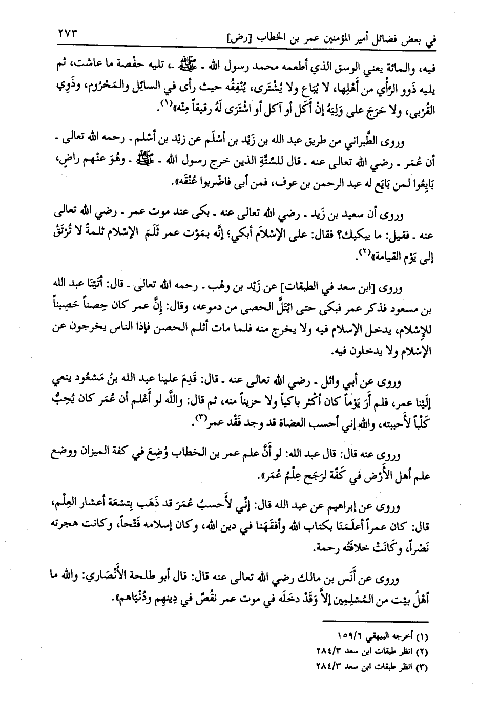 وروى [ابن سعد في الطبقات] عن زيد بن وهب- رحمة الله تعالى- قال: أتينا عبد الله بن مسعود فذكر عمر فبكى حتى ابتلّ الحصى من دموعه، وقال: إنّ عمر كان حصنا حصينا للإسلام، يدخل الإسلام فيه ولا يخرج منه فلما مات أثلم الحصن فإذا الناس يخرجون عن الإسلام ولا يدخلون فيه.