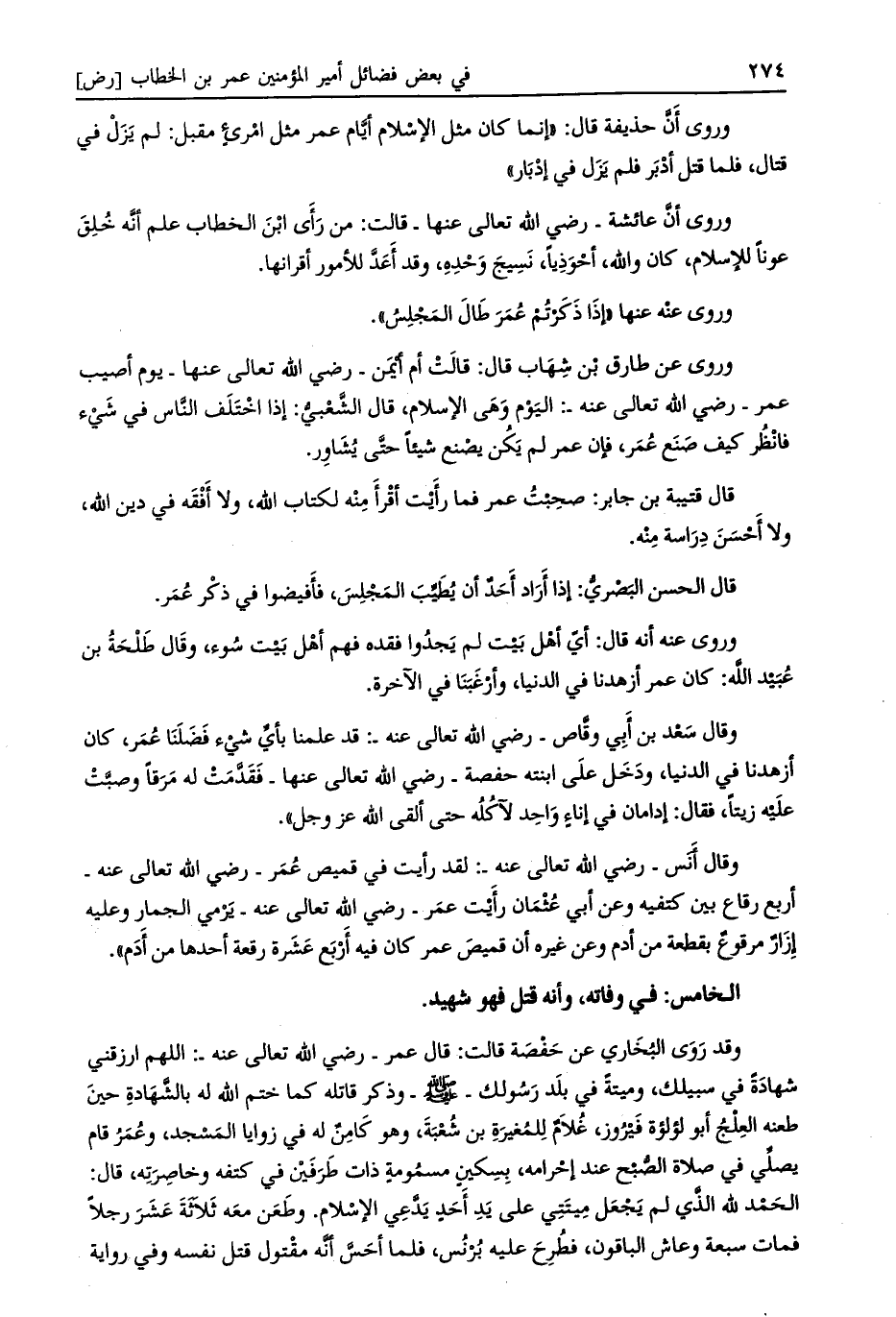 وقد روى البخاري عن حفصة قالت: قال عمر- رضي الله تعالى عنه-: اللهم ارزقني شهادة في سبيلك، وميتة في بلد رسولك- صلى الله عليه وسلم- وذكر قاتله كما ختم الله له بالشّهادة حين طعنه العلج أبو لؤلؤة فيروز، غلام للمغيرة بن شعبة، وهو كامن له في زوايا المسجد، وعمر قام يصلّي في صلاة الصّبح عند إحرامه، بسكين مسمومة ذات طرفين في كتفه وخاصرته، قال: