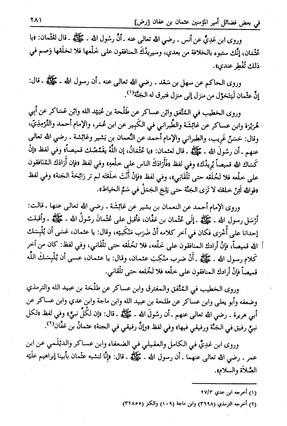 وروى الخطيب في المتّفق وابن عساكر عن طلحة بن عبيد الله وابن عساكر عن أبي هريرة وابن عساكر عن عائشة والطبراني في الكبير عن ابن عمر، والإمام أحمد والترمذي، وقال: حسن غريب، والطبراني والإمام أحمد عن النعمان بن بشير وعائشة- رضي الله تعالى عنهم- أن رسول الله- صلى الله عليه وسلم- قال لعثمان: «يا عثمان، إن الله يقمّصك قميصا» وفي لفظ «أن كساك الله قميصا يريدك» وفي لفظ «فأرادك الناس على خلعه» وفي لفظ «فإن أرادك المنافقون على خلعه فلا تخلعه حتى تلقاني» ، وفي لفظ «فإن أنت خلعته لم تر رائحة الجنة» وفي لفظ «فو الله لئن خلعته لا ترى الجنّة حتى يلج الجمل في سمّ الخياط» .