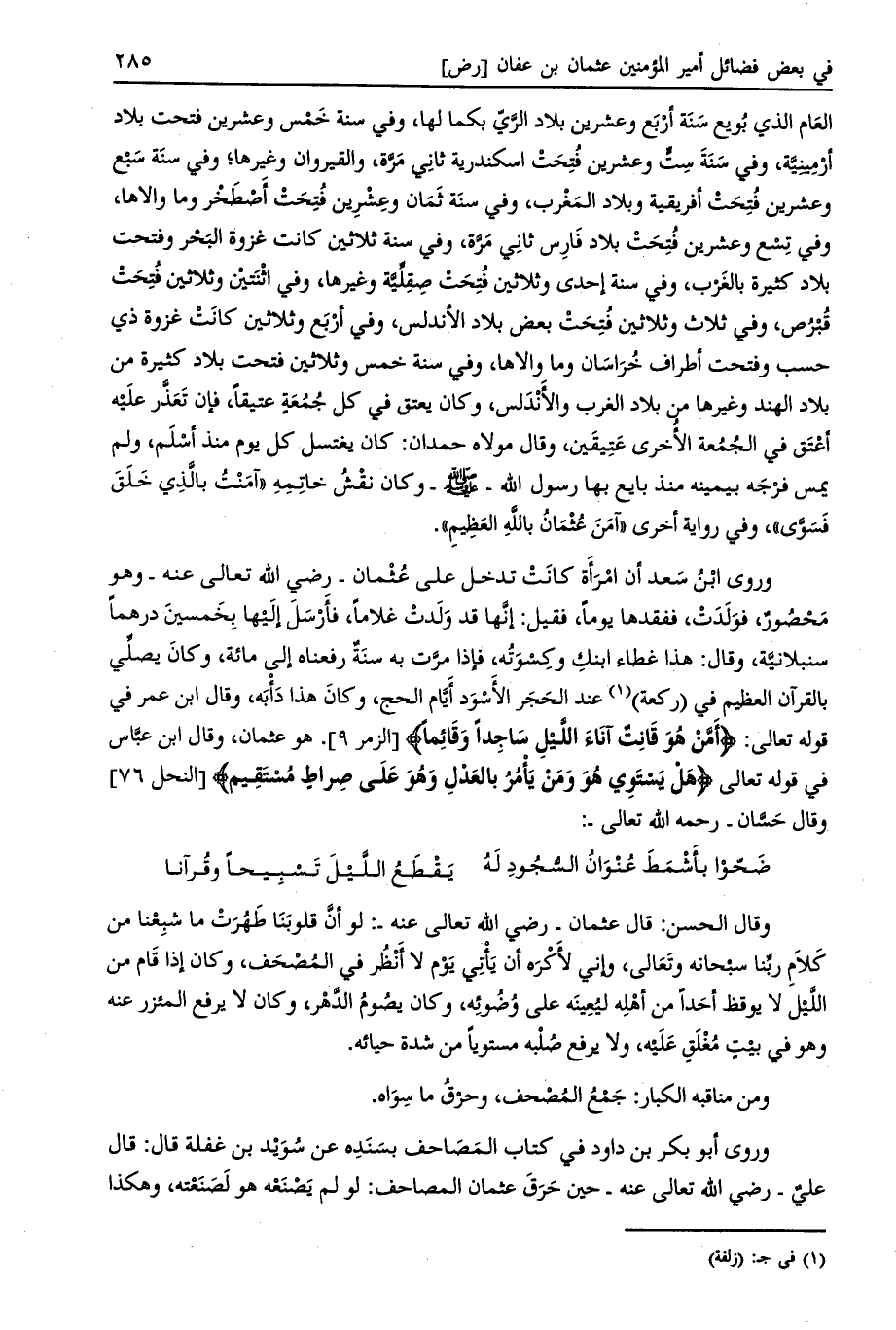 وروى أبو بكر بن داود في كتاب المصاحف بسنده عن سويد بن غفلة قال: قال علي- رضي الله تعالى عنه- حين حرق عثمان المصاحف: لو لم يصنعه هو لصنعته، وهكذا