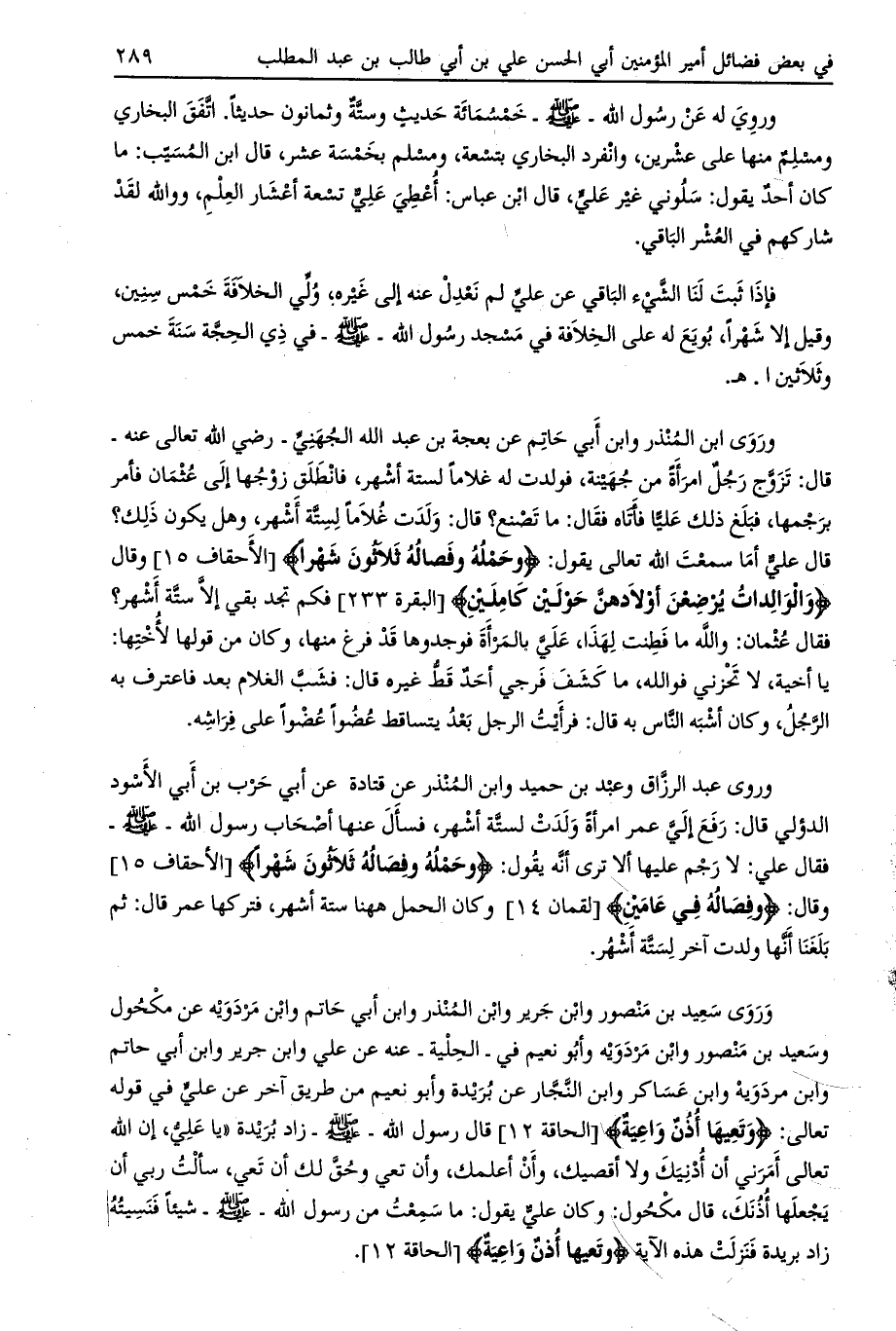 قال عليّ أما سمعت الله تعالى يقول: وَحَمْلُهُ وَفِصالُهُ ثَلاثُونَ شَهْراً [الأحقاف 15] وقال وَالْوالِداتُ يُرْضِعْنَ أَوْلادَهُنَّ حَوْلَيْنِ كامِلَيْنِ [البقرة 233] فكم تجد بقي إلّا ستّة أشهر؟
