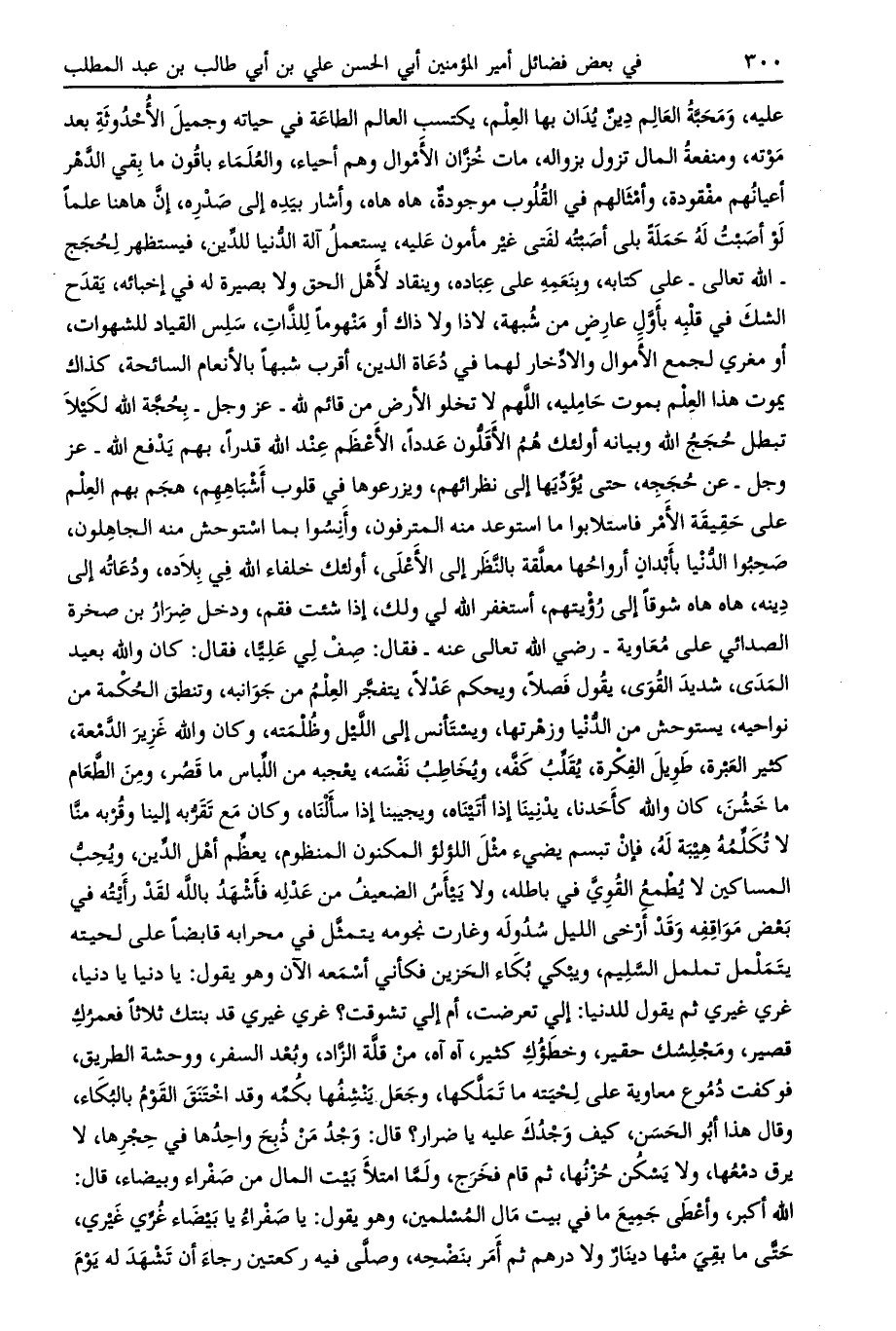 عليه، ومحبّة العالم دين يدان بها العلم، يكتسب العالم الطاعة في حياته وجميل الأحدوثة بعد موته، ومنفعة المال تزول بزواله، مات خزّان الأموال وهم أحياء، والعلماء باقون ما بقي الدّهر أعيانهم مفقودة، وأمثالهم في القلوب موجودة، هاه هاه، وأشار بيده إلى صدره، إنّ هاهنا علما لو أصبت له حملة بلى أصبته لفتى غير مأمون عليه، يستعمل آلة الدّنيا للدّين، فيستظهر لحجج- الله تعالى- على كتابه، وبنعمه على عباده، وينقاد لأهل الحق ولا بصيرة له في إخبائه، يقدح الشك في قلبه بأوّل عارض من شبهة، لا ذا ولا ذاك أو منهوما للذّات، سلس القياد للشهوات، أو مغري لجمع الأموال والادّخار لهما في دعاء الدين، أقرب شبها بالأنعام السائحة، كذاك يموت هذا العلم بموت حامليه، اللهم لا تخلو الأرض من قائم لله- عز وجل- بحجّة الله لكيلا تبطل حجج الله وبيانه أولئك هم الأقلّون عددا، الأعظم عند الله قدرا، بهم يدفع الله- عز وجل- عن حججه، حتى يؤدّيها إلى نظرائهم، ويزرعوها في قلوب أشباههم، هجم بهم العلم على حقيقة الأمر فاستلابوا ما استوعد منه المترفون، وأنسوا بما استوحش منه الجاهلون، صحبوا الدّنيا بأبدان أرواحها معلّقة بالنّظر إلى الأعلى، أولئك خلفاء الله في بلاده، ودعاته إلى دينه، هاه هاه شوقا إلى رؤيتهم، أستغفر الله لي ولك، إذا شئت فقم،