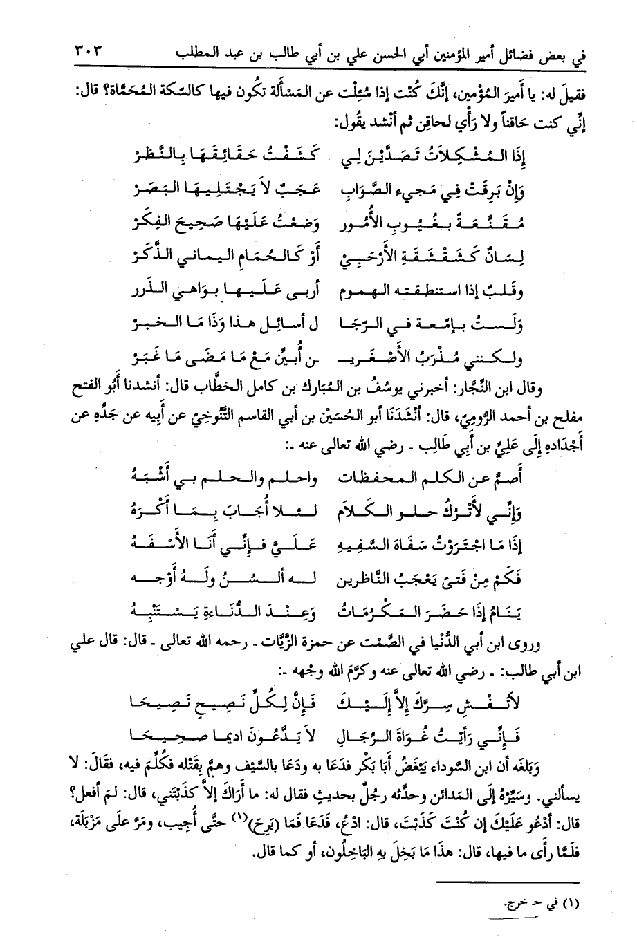 وقال ابن النّجّار: أخبرني يوسف بن المبارك بن كامل الخطّاب قال: أنشدنا أبو الفتح مفلح بن أحمد الرّوميّ، قال: أنشدنا أبو الحسين بن أبي القاسم التّنوخيّ عن أبيه عن جدّه عن أجداده إلى علي بن أبي طالب- رضي الله تعالى عنه-: