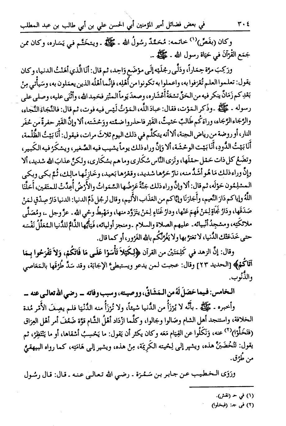 وأخبره- صلى الله عليه وسلم- بأنه لا يزرأ من الدّنيا شيئا، ولا ترزأ منه الدّنيا فلم يصف الأمر مدة الخلافة، واستنجد أهل الشام وصالوا وجالوا، وكلّما ازداد أهل الشّام قوّة ضعف أمر أهل العراق (فتخلّوا) [ (2) ] عنه، ونكلوا عن القيام معه