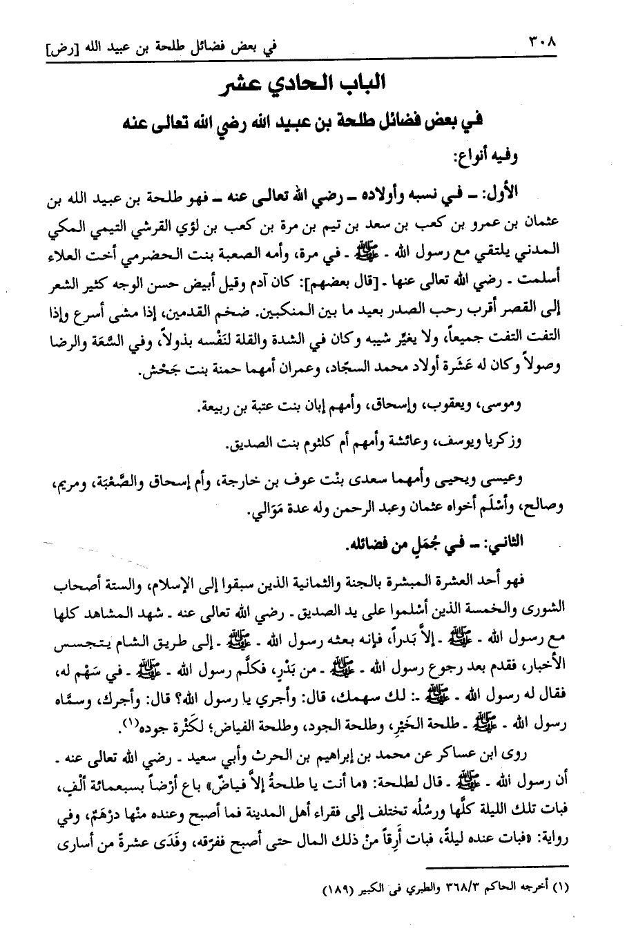 الباب الحادي عشر في بعض فضائل طلحة بن عبيد الله رضي الله تعالى عنه