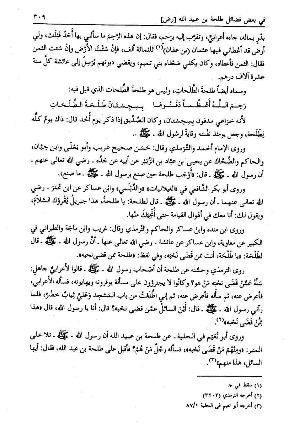 وروى أبو نعيم في الحلية- عن طلحة بن عبيد الله أن رسول الله- صلى الله عليه وسلم- تلا على المنبر: «ومنهم من قضى نحبه» ، فسأله رجل من هم؟ فأقبل على طلحة بن عبد الله، فقال: أيها السائل، هذا منهم»