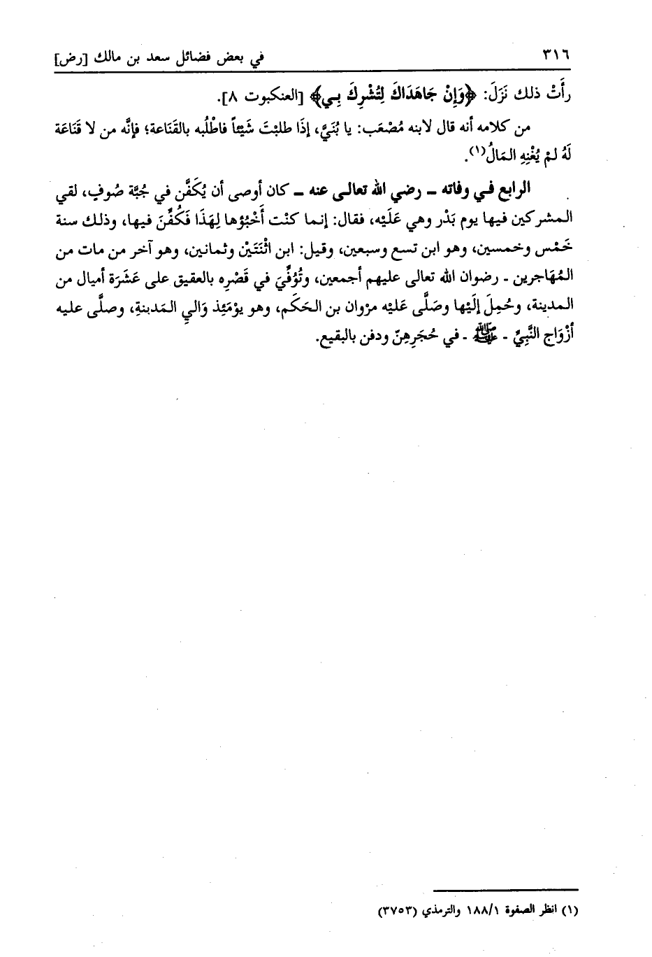 كان أوصى أن يكفن في جبّة صوف، لقي المشركين فيها يوم بدر وهي عليه، فقال: إنما كنت أخبؤها لهذا فكفّن فيها، وذلك سنة خمس وخمسين، وهو ابن تسع وسبعين، وقيل: ابن اثنتين وثمانين، وهو آخر من مات من المهاجرين- رضوان الله تعالى عليهم أجمعين، وتوفّي في قصره بالعقيق على عشرة أميال من المدينة، وحمل إليها وصلّى عليه مروان بن الحكم، وهو يومئذ وإلي المدينة، وصلّى عليه أزواج النبي- صلى الله عليه وسلم- في حجرهنّ ودفن بالبقيع.