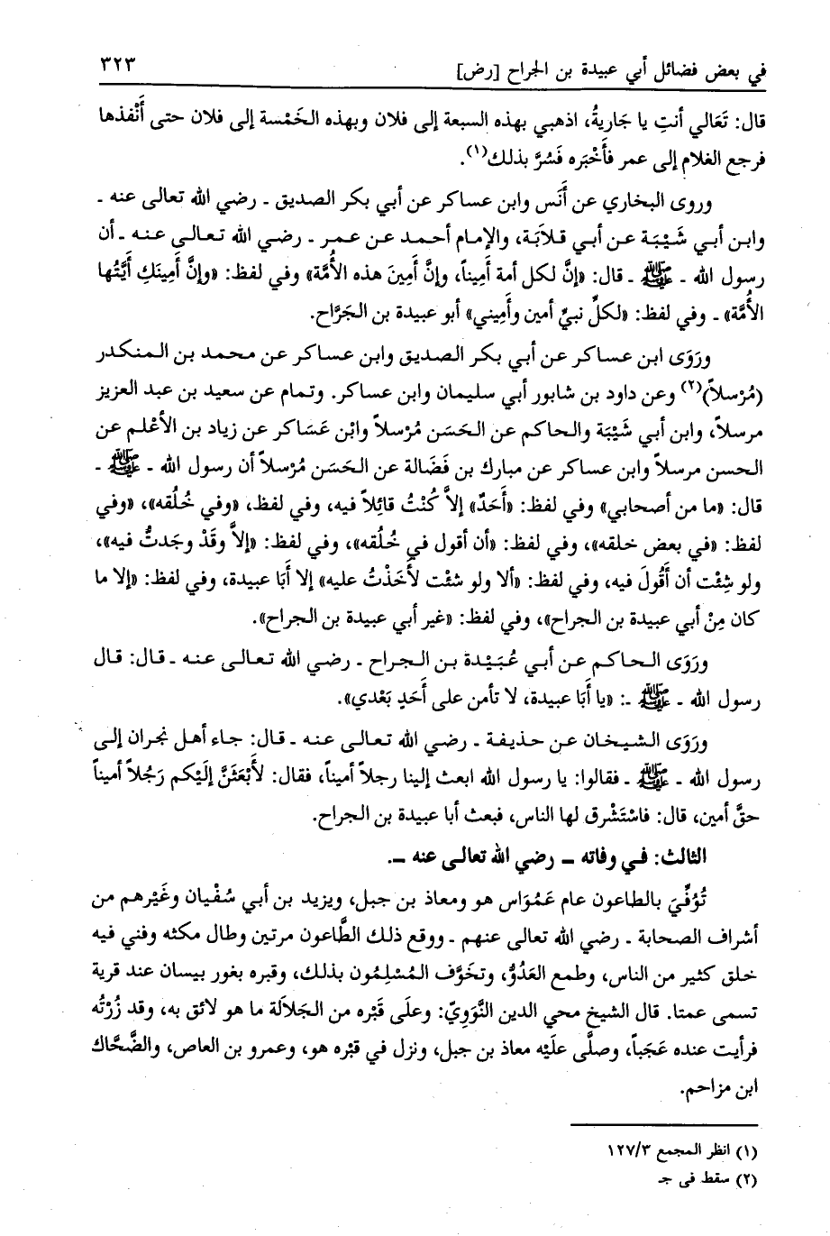 وروى البخاري عن أنس وابن عساكر عن أبي بكر الصديق- رضي الله تعالى عنه- وابن أبي شيبة عن أبي قلابة، والإمام أحمد عن عمر- رضي الله تعالى عنه- أن رسول الله- صلى الله عليه وسلم- قال: «إنّ لكل أمة أمينا، وإنّ أمين هذه الأمة» وفي لفظ: «وإنّ أمينك أيّتها الأمة» - وفي لفظ: «لكلّ نبيّ أمين وأميني» أبو عبيدة بن الجراح.