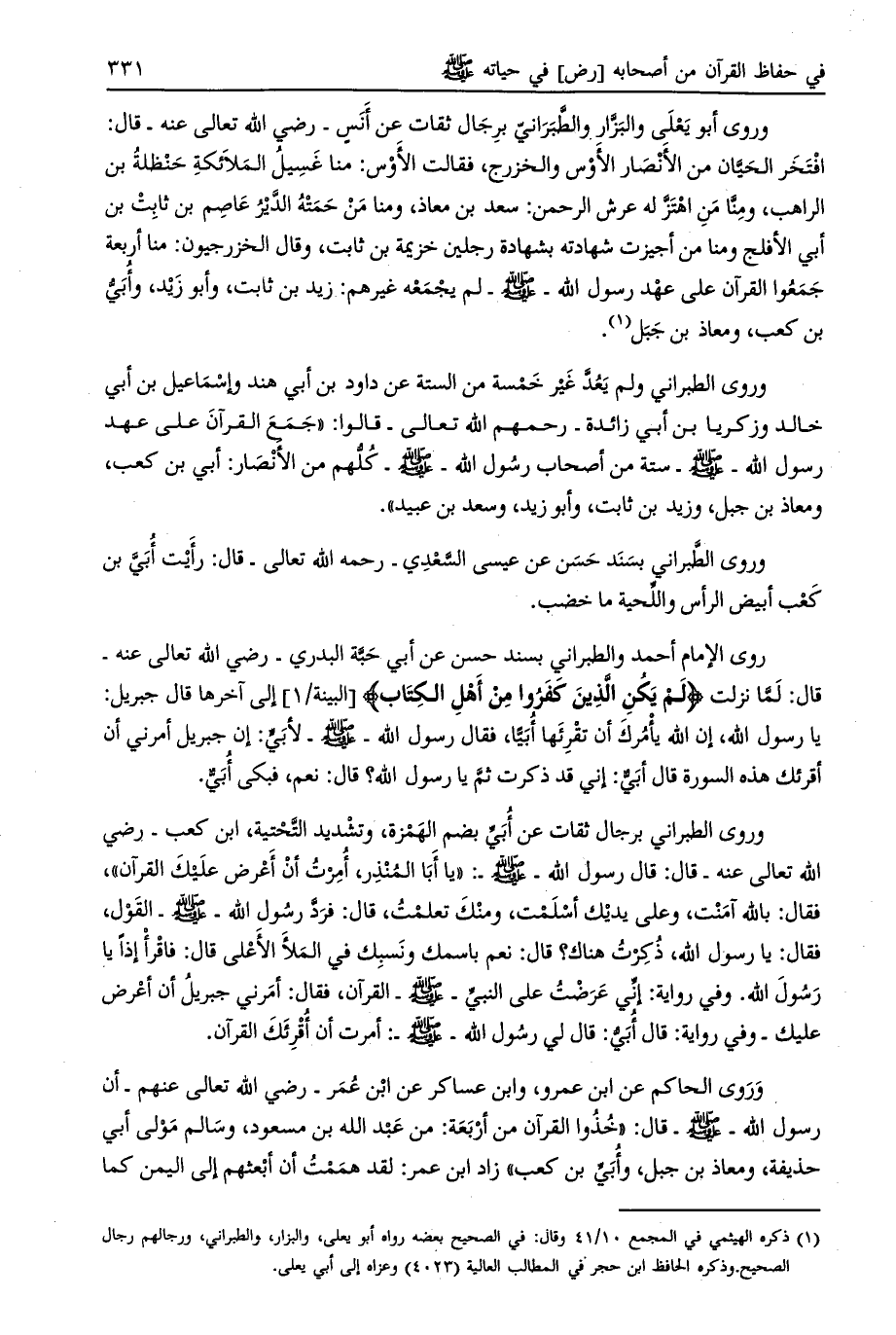 وروى الطبراني برجال ثقات عن أبي بضم الهمزة، وتشديد التّحية، ابن كعب- رضي الله تعالى عنه- قال: قال رسول الله- صلى الله عليه وسلم-: «يا أبا المنذر، أمرت أن أعرض عليك القرآن» ، فقال: بالله آمنت، وعلى يديك أسلمت، ومنك تعلمت، قال: فردّ رسول الله- صلى الله عليه وسلم- القول، فقال: يا رسول الله، ذكرت هناك؟ قال: نعم باسمك ونسبك في الملأ الأعلى قال: فأقرأ إذا يا رسول الله.