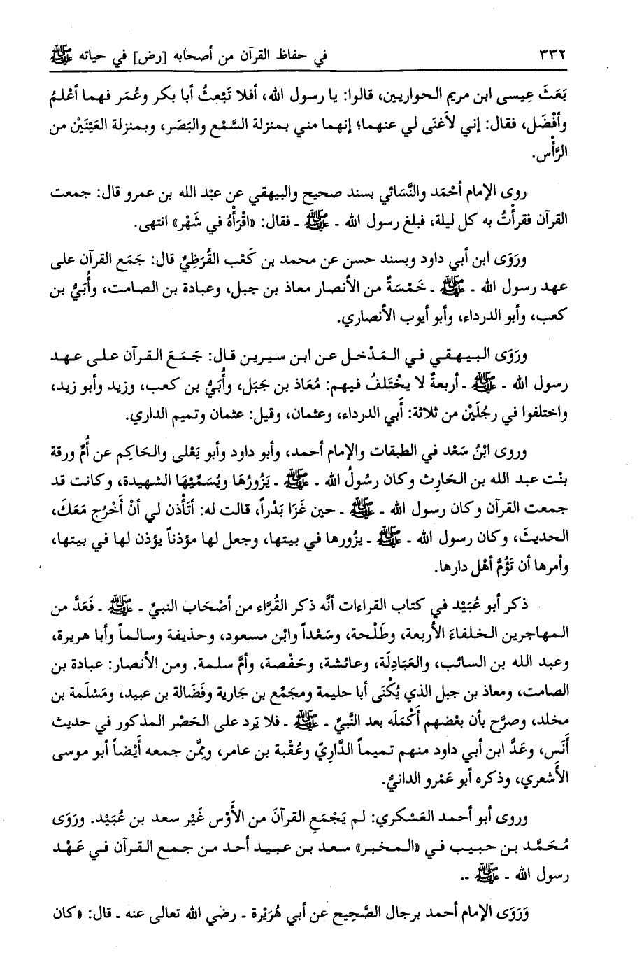 وروى البيهقي في المدخل عن ابن سيرين قال: جمع القرآن على عهد رسول الله- صلى الله عليه وسلم- أربعة لا يختلف فيهم: معاذ بن جبل، وأبي بن كعب، وزيد وأبو زيد، واختلفوا في رجلين من ثلاثة: أبي الدرداء، وعثمان، وقيل: عثمان وتميم الداري.