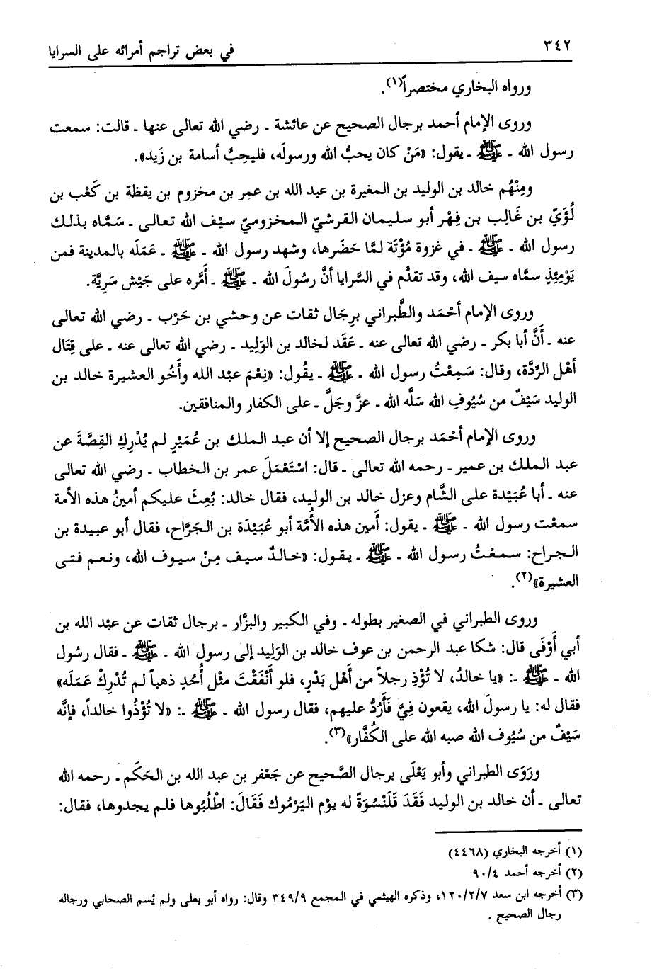 وروى الإمام أحمد والطبراني برجال ثقات عن وحشي بن حرب- رضي الله تعالى عنه- أن أبا بكر- رضي الله تعالى عنه- عقد لخالد بن الوليد- رضي الله تعالى عنه- على قتال أهل الردة، وقال: سمعت رسول الله- صلى الله عليه وسلم- يقول: «نعم عبد الله وأخو العشيرة خالد بن الوليد سيف من سيوف الله سلّه الله- عز وجل- على الكفار والمنافقين.