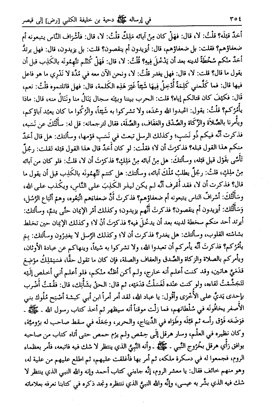 أحد قبله؟ قلت: لا، قال: فهل كان من آبائه ملك قلت: لا، قال: فأشراف النّاس يتبعونه أم ضعفاؤهم؟ فقلت: بل ضعفاؤهم، قال: أيزيدون أم ينقصون؟ قلت: بل يزيدون، قال: فهل يرتدّ أحد منكم سخطة لدينه بعد أن يدخل فيه؟ قلت: لا، قال: فهل كنتم تتّهمونه بالكذب قبل أن يقول ما قال؟ قلت: لا، قال: فهل يغدر قلت: لا، ونحن الآن معه في مدّة لا ندري ما هو فاعل فيها قال: فما كلّمني كلمة أدخل فيها شيئا غير هذه الكلمة، قال: فهل قاتلتموه قلت: نعم، قال: فكيف كان قتالكم إياه؟ قلت: الحرب بيننا وبينه سجال ينال منا وننال منه، قال: ماذا يأمركم؟ قلت: يقول: اعبدوا الله وحده، ولا تشركوا به شيئا، واتركوا ما كان يعبد آباؤكم، ويأمرنا بالصّلاة والزّكاة والصّدق والعفاف، والصّلة، فقال لترجمانه: قل له: سألتك عن نسبه، فذكرت أنّه فيكم ذو نسب، وكذلك الرسل تبعث في نسب قومها، وسألتك: هل قال أحد منكم هذا القول قبله؟ فذكرت أن لا، فقلت: لو كان أحد قال هذا القول قبله لقلت: رجل تأسّى بقول قيل قبله، وسألتك: هل من آبائه من ملك؟ فذكرت أن لا، قلت: فلو كان من آبائه من ملك، قلت: رجل يطلب ملك آبائه، وسألتك: هل كنتم تتّهمونه بالكذب قبل أن يقول ما قال؟ فذكرت أن لا، فقد أعرف أنه لم يكن ليذر الكذب على النّاس، ويكذب على الله، وسألتك: أشراف الناس يتبعونه أم ضعفاؤهم؟ فذكرت أنّ ضعفاءهم اتّبعوه، وهم أتباع الرّسل، وسألتك: أيزيدون أم ينقصون؟ فذكرت أنّهم يزيدون، وكذلك أمر الإيمان حتّى يتمّ، وسألتك: