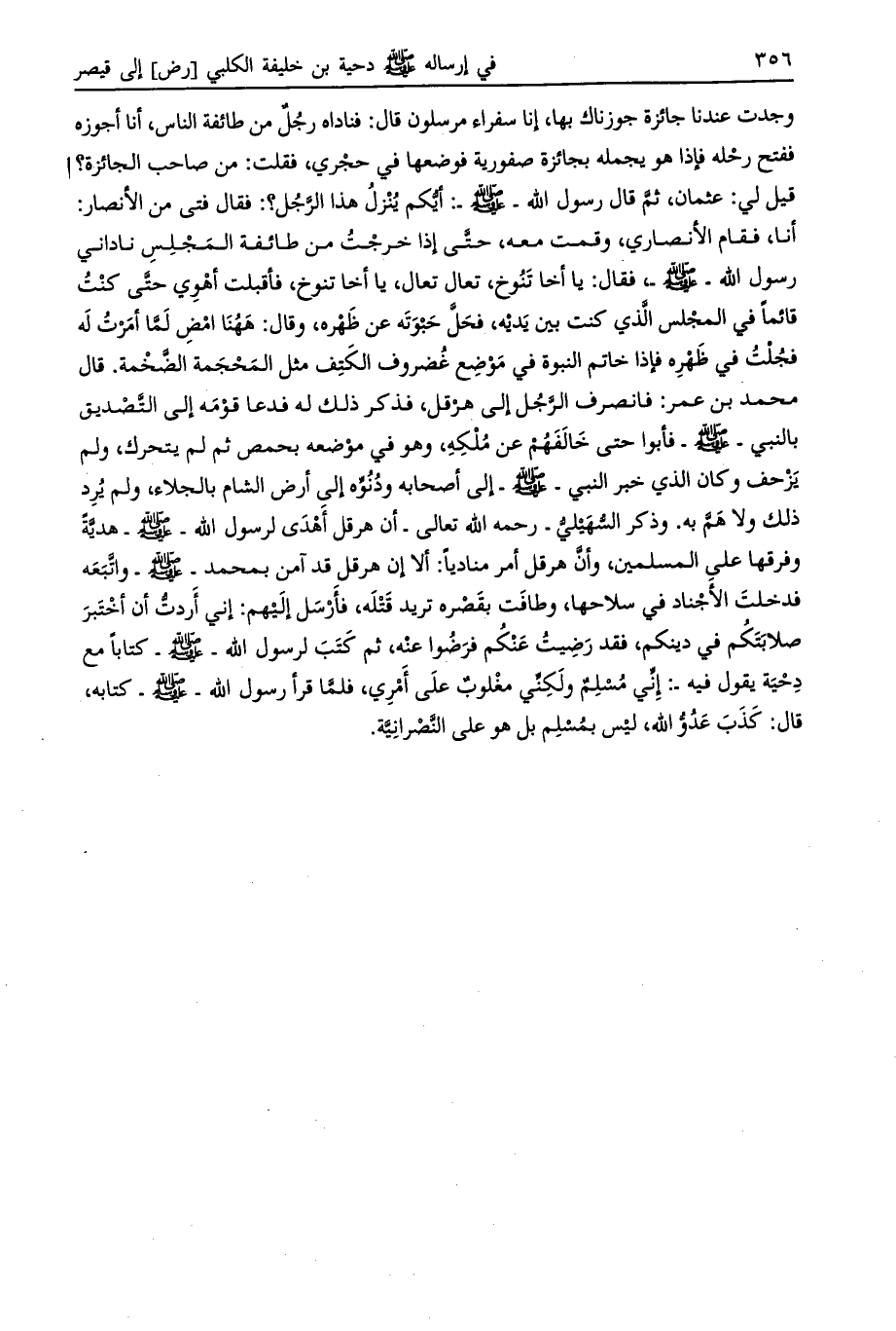 أنا، فقام الأنصاري، وقمت معه، حتى إذا خرجت من طائفة المجلس ناداني رسول الله- صلى الله عليه وسلم-، فقال: يا أخا تنوخ، تعال تعالى، يا أخا تنوخ، فأقبلت أهوي حتّى كنت قائما في المجلس الّذي كنت بين يديه، فحلّ حبوته عن ظهره، وقال: ههنا امض لمّا أمرت له فجلت في ظهره فإذا خاتم النبوة في موضع غضروف الكتف مثل المحجمة الضّخمة. قال محمد بن عمر: فانصرف الرّجل إلى هرقل، فذكر ذلك له فدعا قومه إلى التّصديق بالنبي- صلى الله عليه وسلّم- فأبوا حتى خالفهم عن ملكه، وهو في موضعه بحمص ثم لم يتحرك، ولم يزحف وكان الذي خبر النبي- صلى الله عليه وسلم- إلى أصحابه ودنوّه إلى أرض الشام بالجلاء، ولم يرد ذلك ولا همّ به. وذكر السهيلي- رحمه الله تعالى- أن هرقل أهدى لرسول الله- صلى الله عليه وسلّم- هديّة وفرقها على المسلمين، وأنّ هرقل أمر مناديا: ألا إن هرقل قد آمن بمحمد- صلّى الله عليه وسلم- واتّبعه فدخلت الأجناد في سلاحها، وطافت بقصره تريد قتله، فأرسل إليهم: إني أردتّ أن أختبر صلابتكم في دينكم، فقد رضيت عنكم فرضوا عنه، ثم كتب لرسول الله- صلى الله عليه وسلم- كتابا مع دحية يقول فيه-: إنّي مسلم ولكنّي مغلوب على أمري، فلما قرأ رسول الله- صلى الله عليه وسلّم- كتابه، قال: كذب عدوّ الله، ليس بمسلم بل هو على النّصرانيّة.