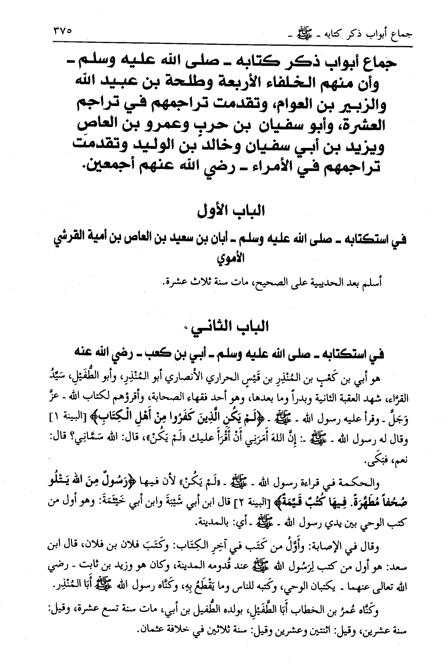 جماع أبواب ذكر كتابه- صلى الله عليه وسلم- وأن منهم الخلفاء الأربعة وطلحة بن عبيد الله والزبير بن العوام، وتقدمت تراجمهم في تراجم العشرة، وأبو سفيان بن حرب وعمرو بن العاص ويزيد بن أبي سفيان وخالد بن الوليد وتقدمت تراجمهم في الأمراء- رضي الله تعالى عنهم أجمعين.