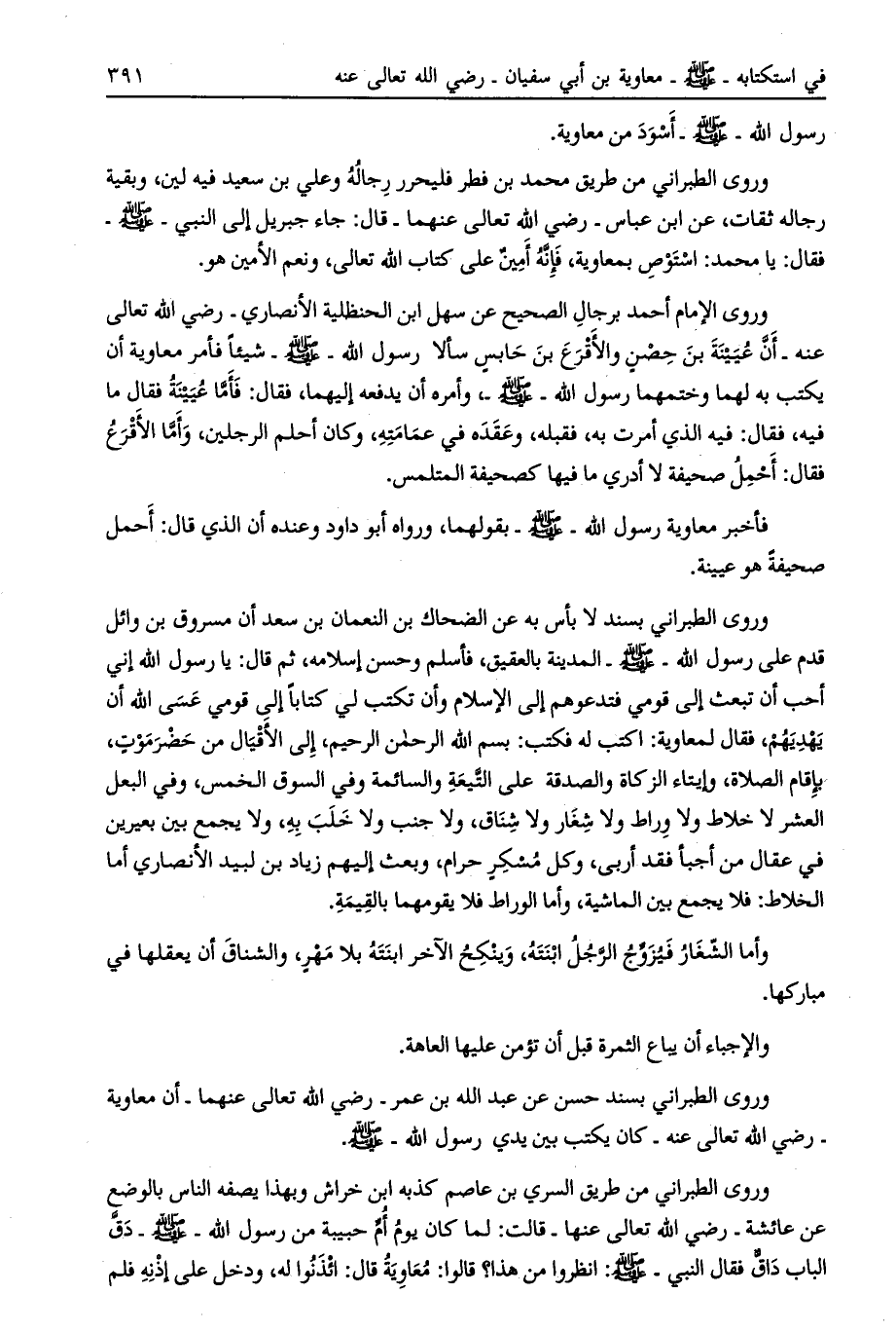 وروى الطبراني بسند حسن عن عبد الله بن عمر- رضي الله تعالى عنهما- أن معاوية- رضي الله تعالى عنه- كان يكتب بين يدي رسول الله- صلى الله عليه وسلم.