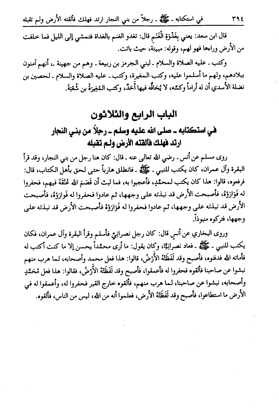 الباب الرابع والثلاثون في استكتابه- صلّى الله عليه وسلم- رجلا من بني النجار ارتدّ فهلك فألقته الأرض ولم تقبله
