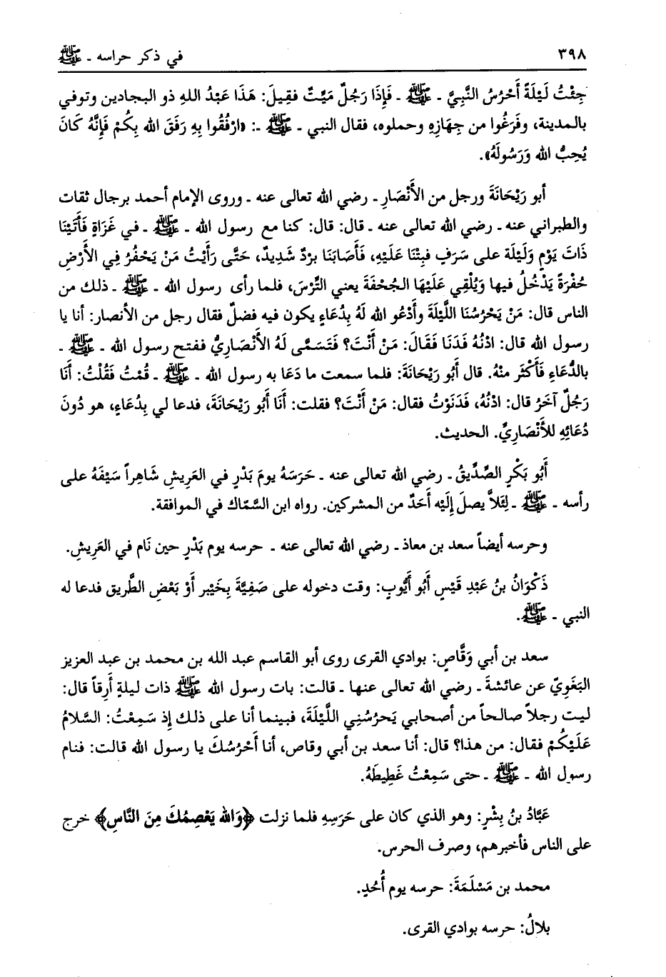 وحرسه أيضا سعد بن معاذ- رضي الله تعالى عنه- حرسه يوم بدر حين نام في العريش.