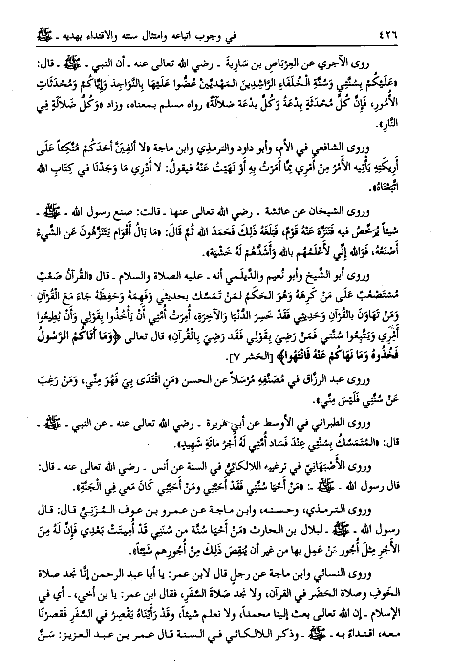 روى الآجري عن العرباص بن سارية- رضي الله تعالى عنه- أن النبي- صلى الله عليه وسلم- قال: «عليكم بسنّتي وسنّة الخلفاء الرّاشدين المهديّين عضّوا عليها بالنّواجذ وإيّاكم ومحدثات الأمور، فإنّ كلّ محدثة بدعة وكلّ بدعة ضلالة» رواه مسلم بمعناه، وزاد «وكلّ ضلالة في النار» .