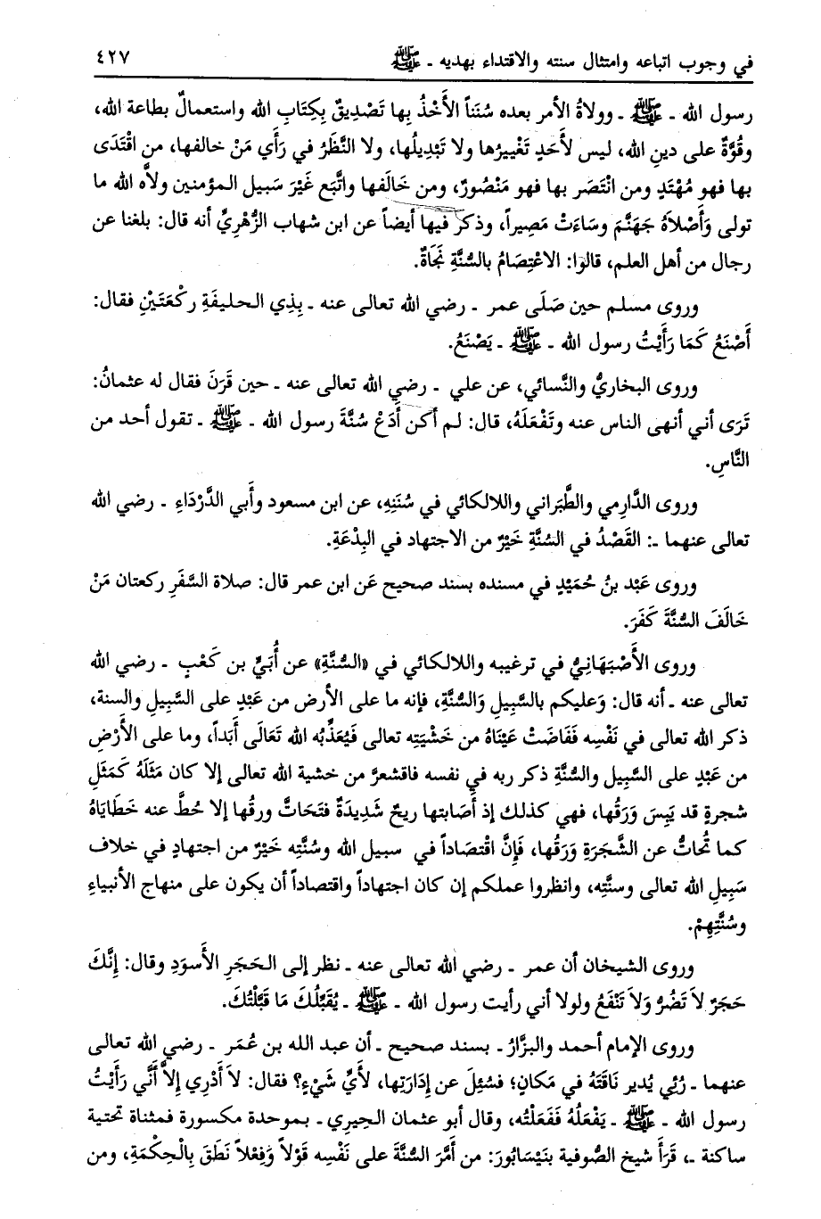 وروى الإمام أحمد والبزّار- بسند صحيح- أن عبد الله بن عمر- رضي الله تعالى عنهما- ربي يدير ناقته في مكان، فسئل عن إدارتها، لأيّ شيء؟ فقال: لا أدري إلّا أني رأيت رسول الله- صلى الله عليه وسلّم- يفعله ففعلته، وقال أبو عثمان الحيري- بموحدة مكسورة فمثناة تحتية ساكنة-، قرأ شيخ الصّوفية بنيسابور: من أمّر السّنّة على نفسه قولا وفعلا نطق بالحكمة، ومن