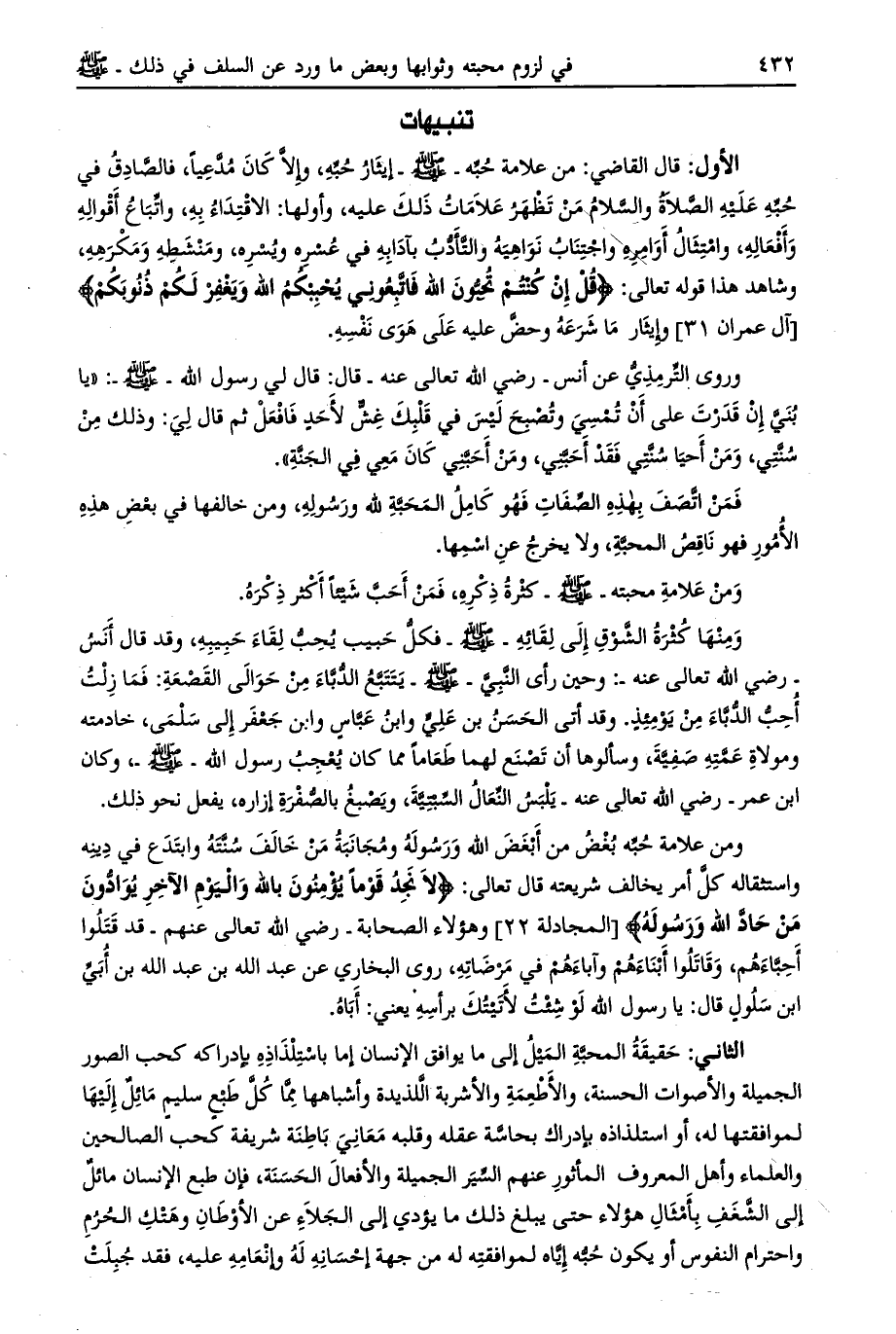 الأول: قال القاضي: من علامة حبّه- صلى الله عليه وسلّم- إيثار حبّه، وإلّا كان مدّعيا، فالصّادق في حبّه عليه الصلاة والسلام من تظهر علامات ذلك عليه، وأولها: الاقتداء به، واتّباع أقواله وأفعاله، وامتثال أوامره واجتناب نواهيه والتّأدّب بآدابه في عسره ويسره، ومنشطه ومكرهه، وشاهد هذا قوله تعالى: قُلْ إِنْ كُنْتُمْ تُحِبُّونَ اللَّهَ فَاتَّبِعُونِي يُحْبِبْكُمُ اللَّهُ وَيَغْفِرْ لَكُمْ ذُنُوبَكُمْ [آل عمران 31] وإيثار ما شرعه وحضّ عليه على هوى نفسه.
