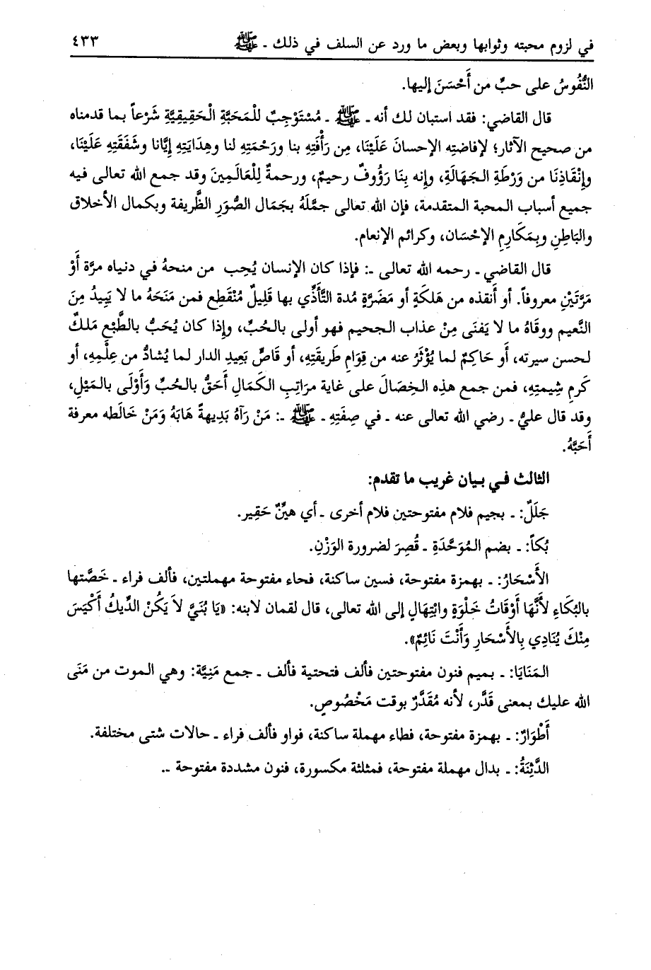 قال القاضي: فقد استبان لك أنه- صلى الله عليه وسلّم- مستوجب للمحبّة الحقيقيّة شرعا بما قدمناه من صحيح الآثار، لإفاضته الإحسان علينا، من رأفته بنا ورحمته لنا وهدايته إيّانا وشفقته علينا، وإنقاذنا من ورطة الجهالة، وإنه بنا رؤوف رحيم، ورحمة للعالمين وقد جمع الله تعالى فيه جميع أسباب المحبة المتقدمة، فإن الله تعالى جمّله بجمال الصّور الظّريفة وبكمال الأخلاق والباطن وبمكارم الإحسان، وكرائم الإنعام.
