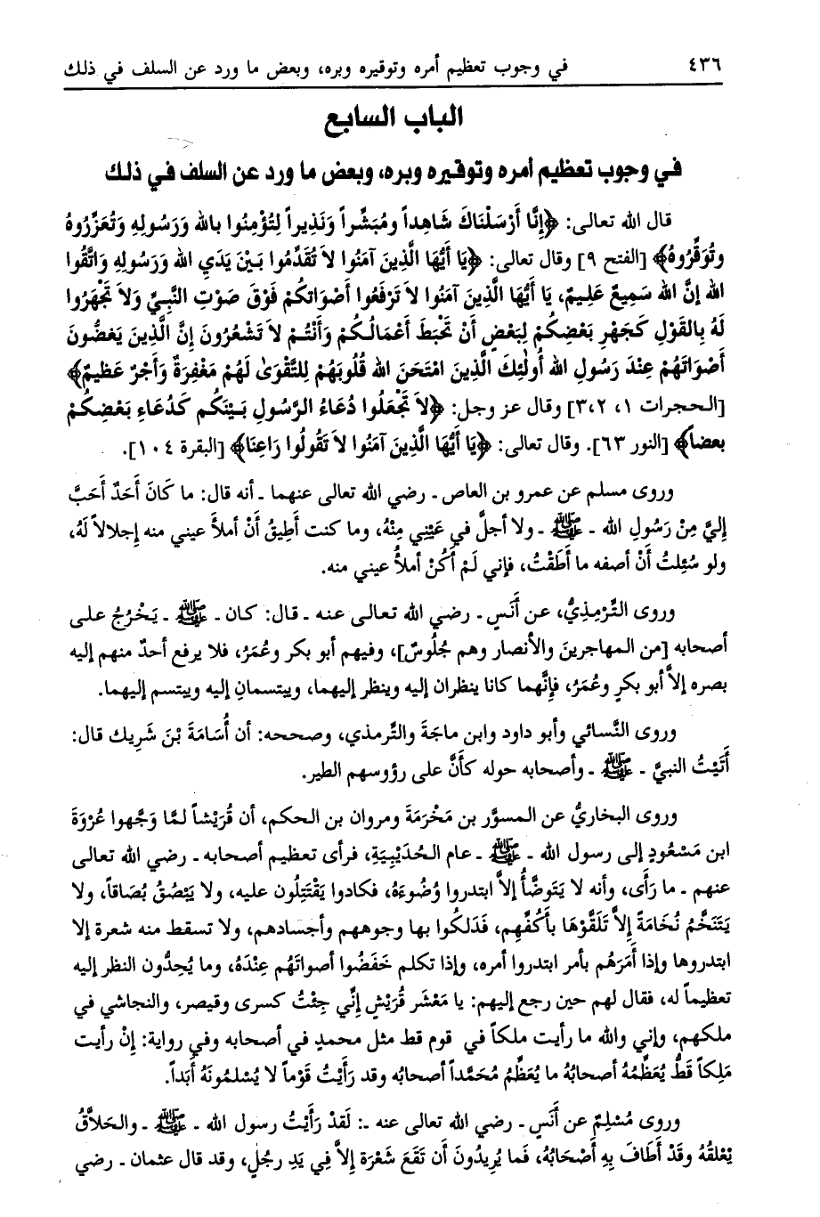 الباب السابع في وجوب تعظيم أمره وتوقيره وبره، وبعض ما ورد عن السلف في ذلك