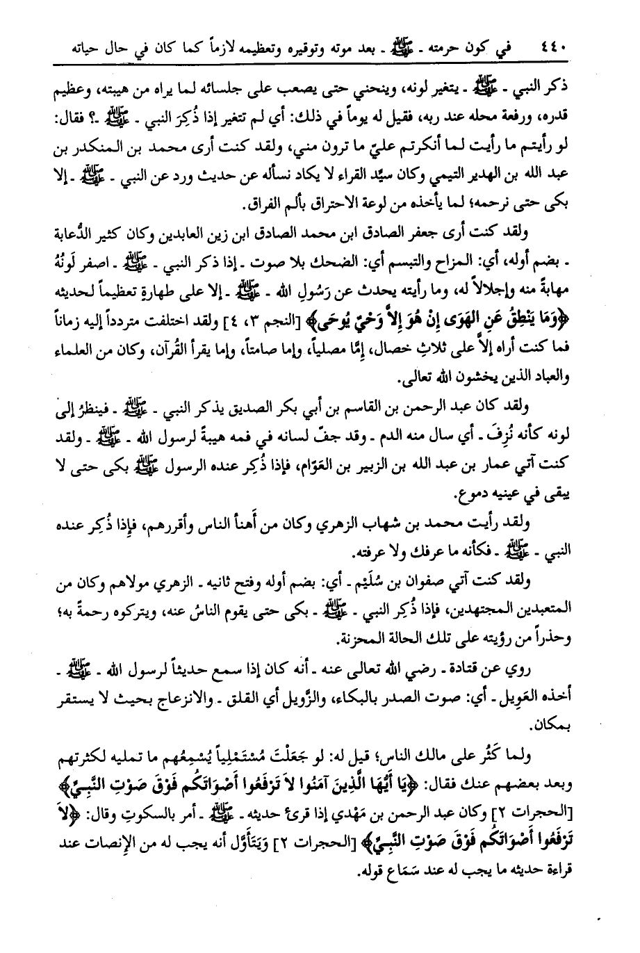 ولقد كان عبد الرحمن بن القاسم بن أبي بكر الصديق يذكر النبي- صلى الله عليه وسلّم- فينظر إلى لونه كأنه نزف- أي سال منه الدم- وقد جفّ لسانه في فمه هيبة لرسول الله- صلى الله عليه وسلم- ولقد كنت آتى عمار بن عبد الله بن الزبير بن العوام، فإذا ذكر عنده الرسول صلى الله عليه وسلم بكى حتى لا يبقى في عينيه دموع.