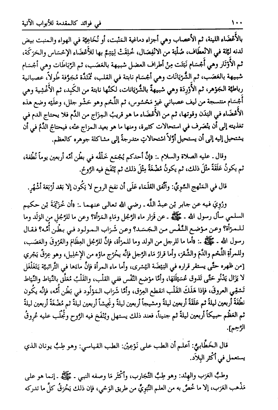 وروي فيه عن جابر بن عبد الله- رضي الله تعالى عنهما-: «أن خزيمة بن حكيم السلمي سأل رسول الله- صلى الله عليه وسلم- عن قرار ماء الرّجل وماء المرأة؟ وعن ما للرّجل من الولد وما للمرأة؟ وعن موضع النّفس من الجسد؟ وعن شراب المولود في بطن أمه؟ فقال رسول الله- صلى الله عليه وسلم-: «أما ما للرجل من الولد وما للمرأة، فإنّ للرّجل العظام والعروق والعصب، وللمرأة اللّحم والدّم والشّعر، وأما قرار ماء الرّجل فإنّه يخرج ماؤه من الإحليل، وهو عرق يجري [من ظهره حتّى يستقر قراره في البيضة اليسرى، وأما ماء المرأة فإنّ ماءها في الثّرائبيّة يتغلغل لا يزال يدنو حتّى تذوق عسيلتها، وأمّا موضع النّفس ففي القلب، والقلب معلّق بالنّياط والنّياط تسقي العروق، فإذا هلك القلب انقطع العرق، وأمّا شراب المولود في بطن أمه، فإنّه يكون نطفة أربعين ليلة ثم علقة أربعين ليلة ومشيجا أربعين ليلة ونجيشا أربعين ليلة ثم مضغة أربعين ليلة ثم العظم حبيكا أربعين ليلة ثم جنينا، فعند ذلك يستهل وينفخ فيه الرّوح وتجلب عليه عروق الرّحم] .