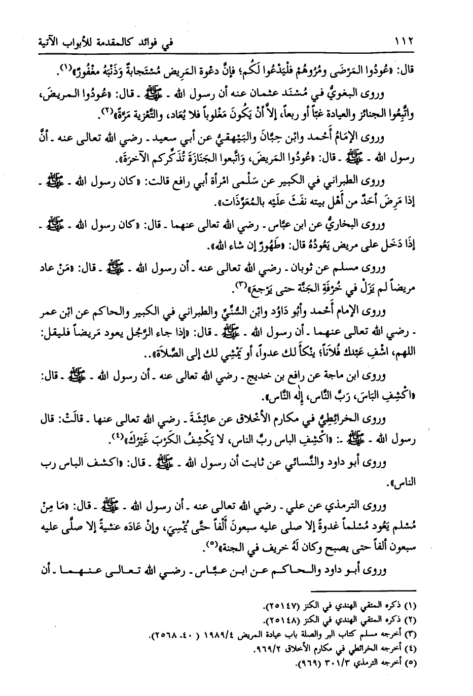 وروى الترمذي عن علي- رضي الله تعالى عنه- أن رسول الله- صلى الله عليه وسلم- قال: «ما من مسلم يعود مسلما غدوة إلا صلى عليه سبعون ألفا حتى يمسي، وإن عاده عشية إلا صلّى عليه سبعون ألفا حتى يصبح وكان له خريف في الجنة»
