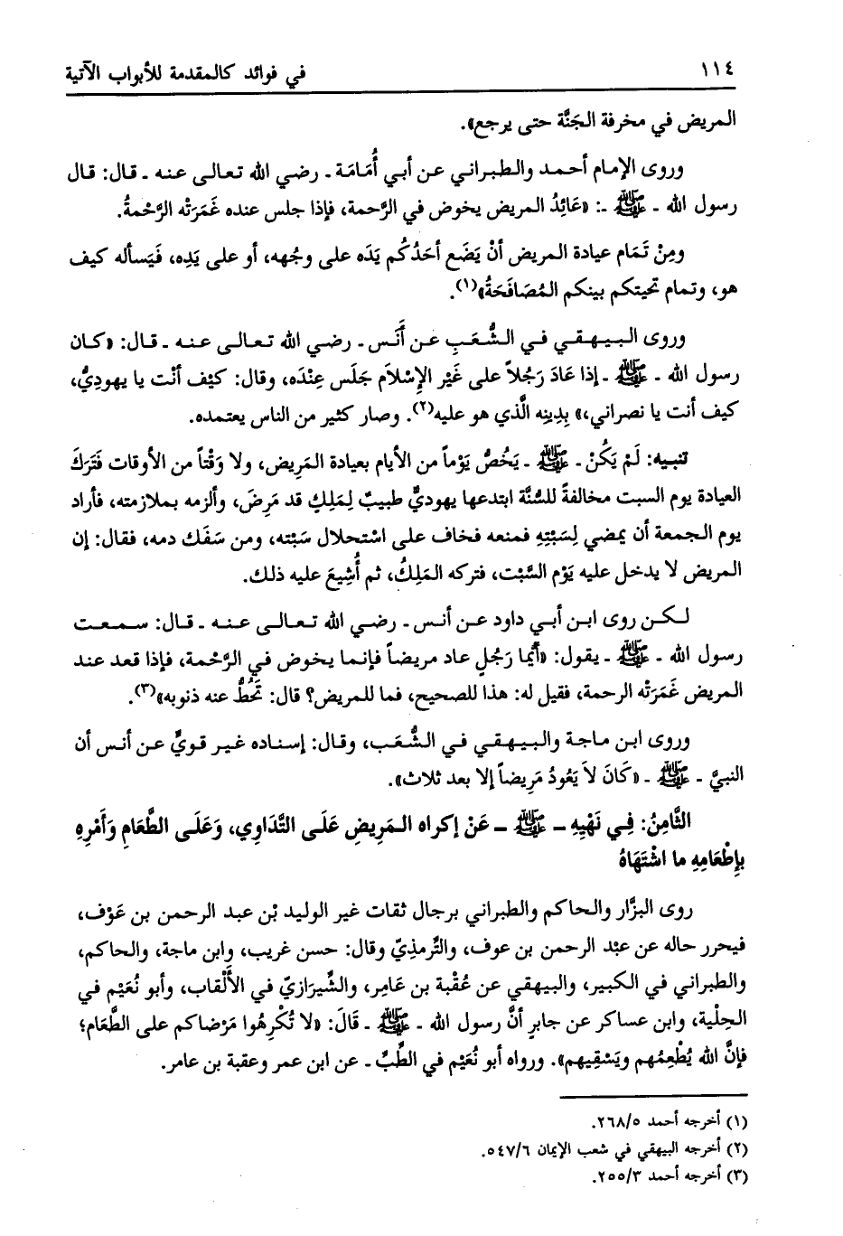 وروى ابن ماجه والبيهقي في الشعب، وقال: إسناده غير قويّ عن أنس أن النبي- صلى الله عليه وسلم- «كان لا يعود مريضا إلا بعد ثلاث» .