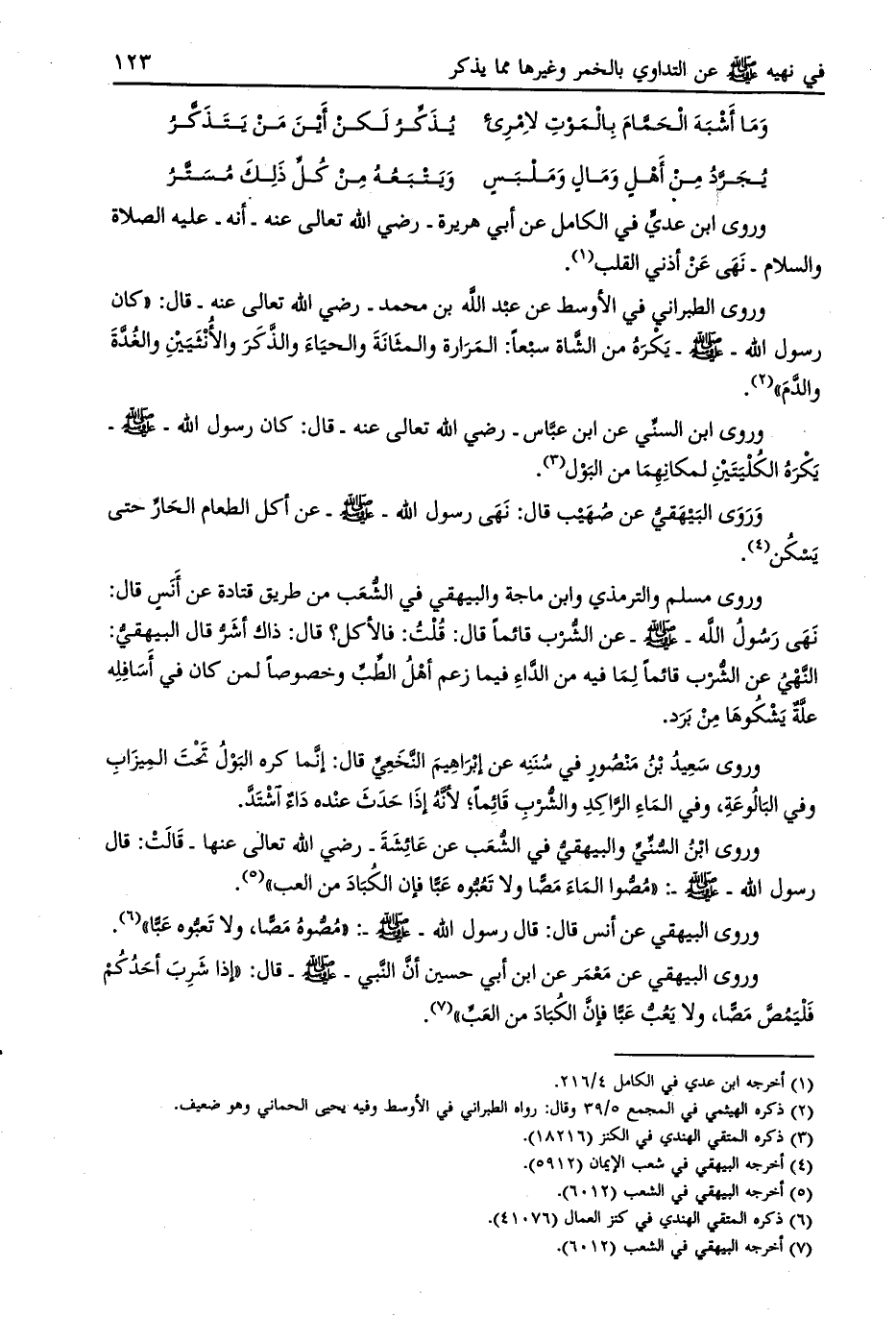 وروى الطبراني في الأوسط عن عبد الله بن محمد- رضي الله تعالى عنه- قال: «كان رسول الله- صلى الله عليه وسلم- يكره من الشّاة سبعا: المرارة والمثانة والحياء والذّكر والأنثيين والغدّة والدّم»