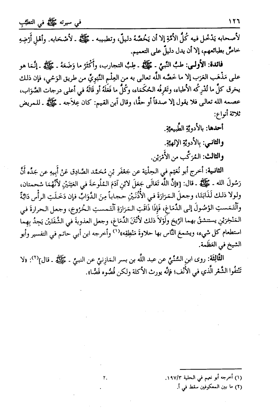 الأولى: طبّ النبي- صلى الله عليه وسلم- طب التجارب، وأكثر ما وضعه- صلى الله عليه وسلم- إنما هو على مذهب العرب إلا ما خصه الله تعالى به من العلم النّبويّ من طريق الوحي، فإن ذلك يخرق كلّ ما تدركه الأطباء، وتعرفه الحكماء، وكلّ ما فعله أو قاله في أعلى درجات الصّواب، عصمة الله تعالى فلا يقول إلا صدقا أو حقّا، وقال ابن القيم: كان علاجه- صلّى الله عليه وسلم- للمريض ثلاثة أنواع: